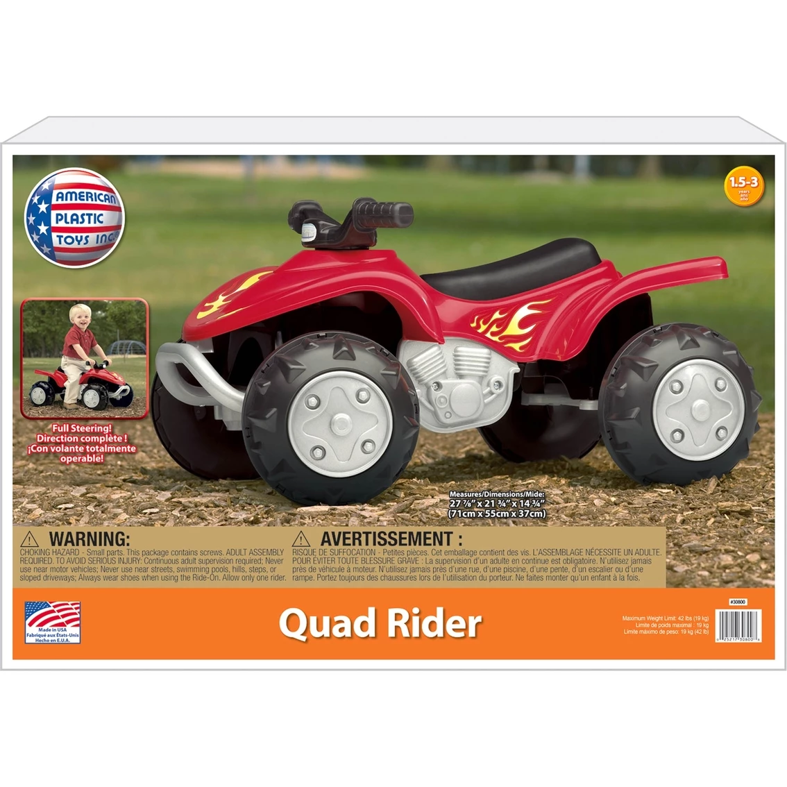 He’ll have a blast riding the trails with this sturdy ATV from American Plastic Toys. It features knobby wheels, fully functional steering, rugged off-road styling and lots of colorful decals. Packaged in a colorful corrugated carton. Designed for ages 18 months to 3 years. Measures 27.875 in. x 21.75 in. x 14.75 in. Model: 30800.