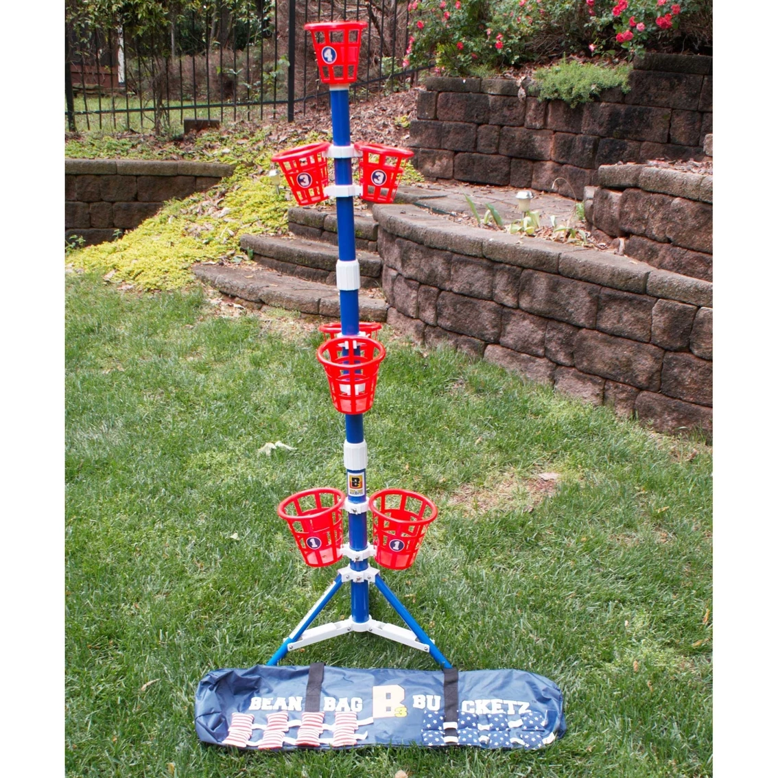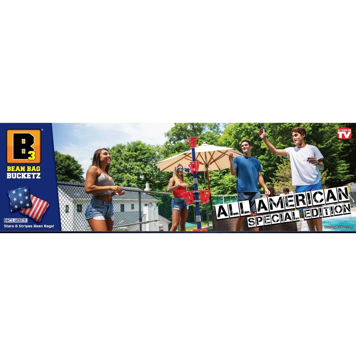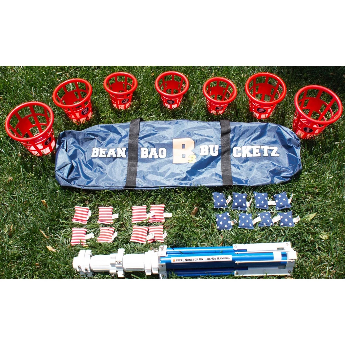* Set has 16 B3 Bean Bags ( Blue bean bags w/white stars and 8 White and Red Stripes Bean Bags), 7 – Red Bucketz, Blue and White telescopic game tower and carrying bag
