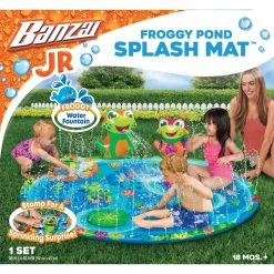 Refreshing water sprinkling rim and frog fountain. Stomp pad for shooting water. Easily attaches to garden hose. Froggy mat is 58 in. x 42 in. Model: G191124136901.