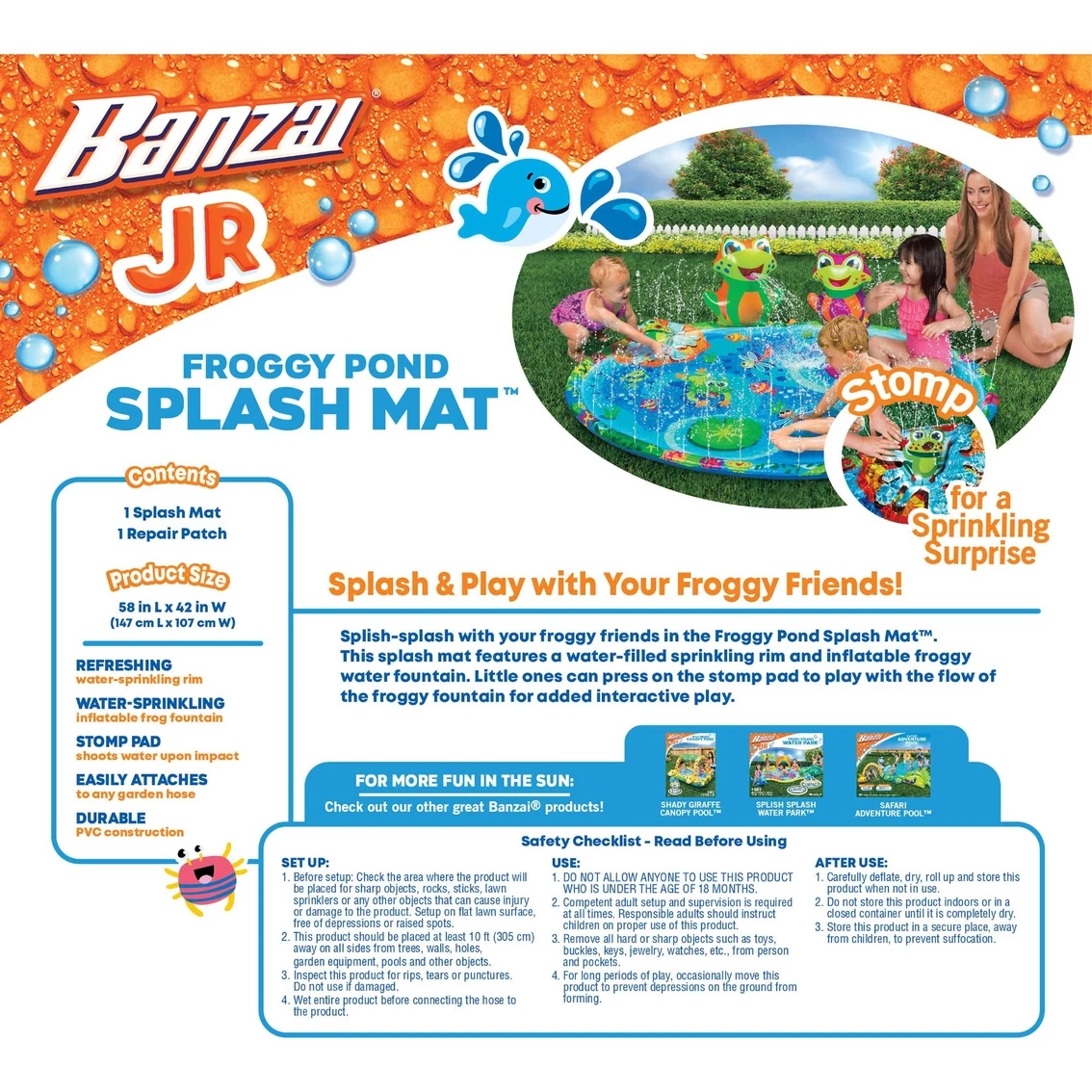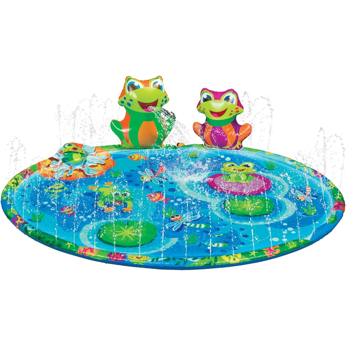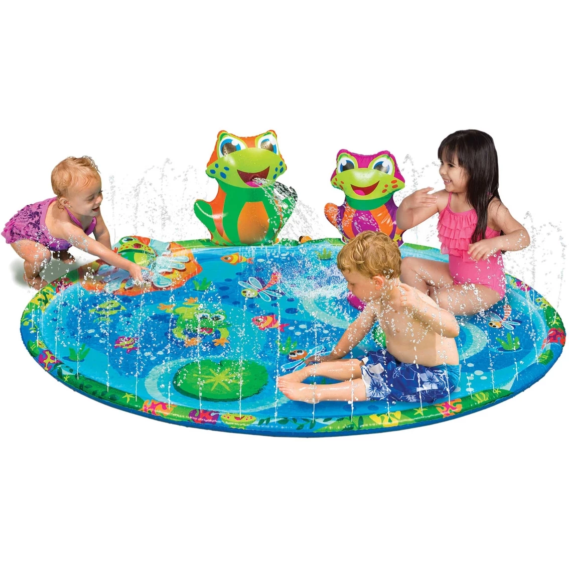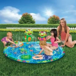 Splish-splash with your froggy friends in the Froggy Pond Splash mat. The shallow splash mat features a water filled sprinkling rim and inflatable froggy fountain.