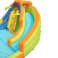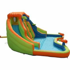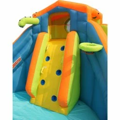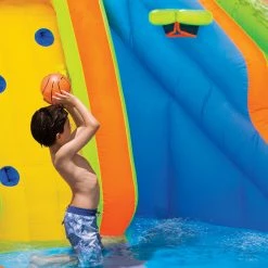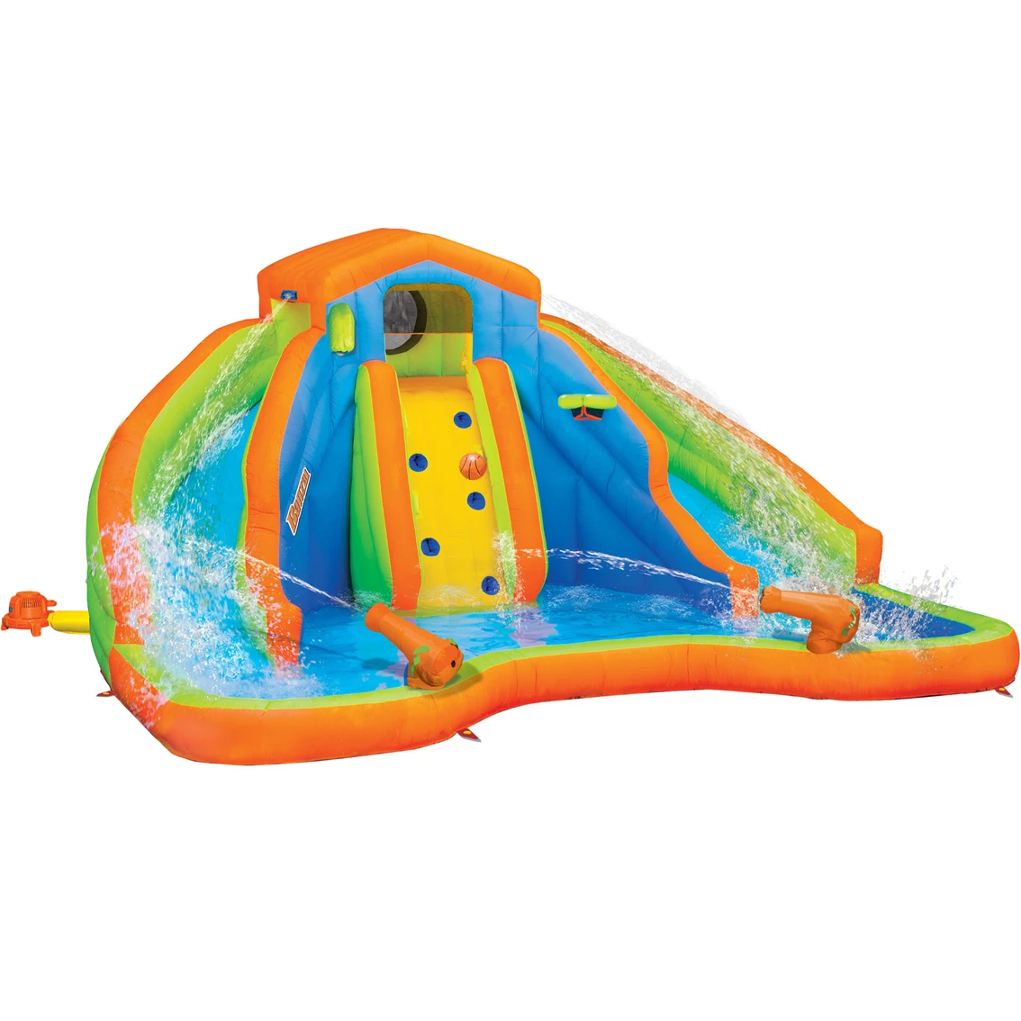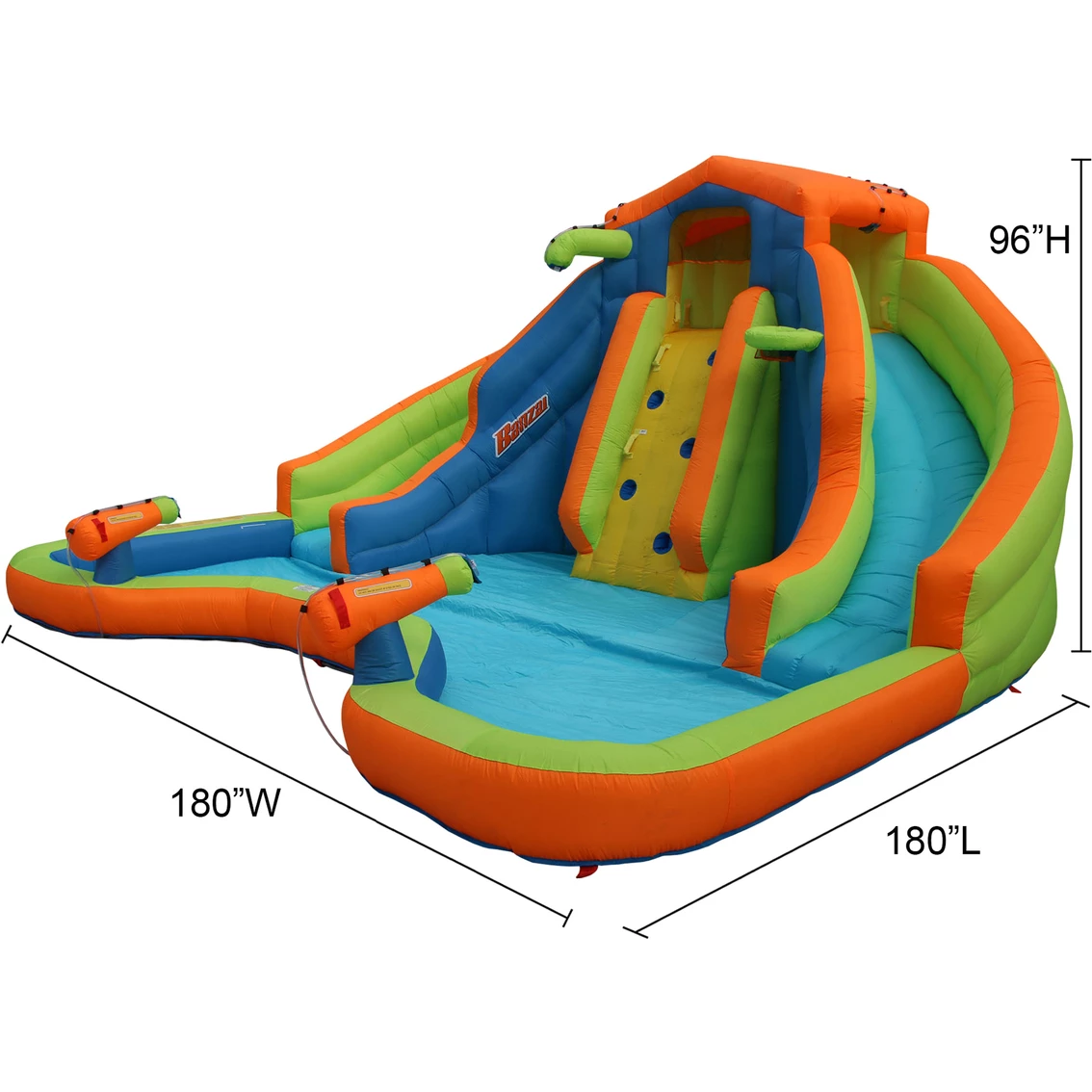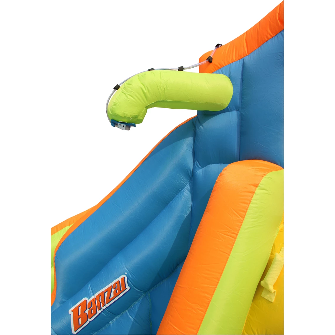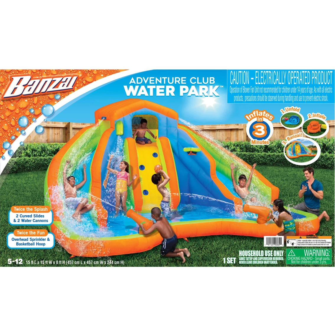 Have twice the fun and twice the splash with the Banzai Inflatable Adventure Club Water Park. Race down the two curved slides with overhead sprinklers keeping you wet all the way into the splash activity pool. Blast away with the two water cannons, them try your skill at the basketball hoop.