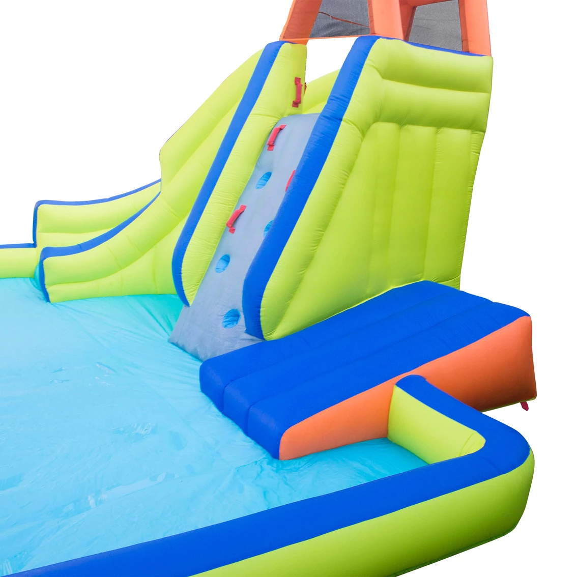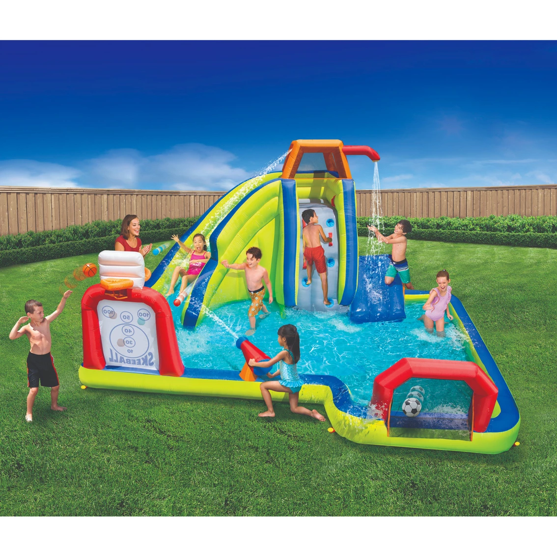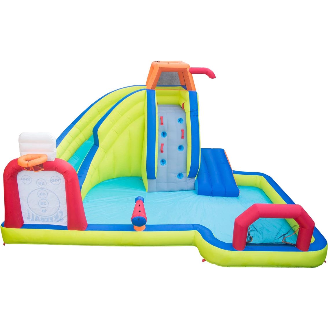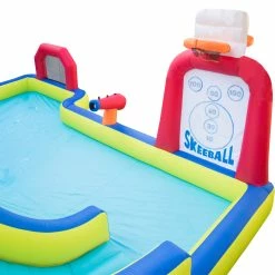Banzai Inflatable Arcade Splash Water Park — make a splash in, out and around this all in-one game water park. Try your skill at the double sided basketball backboard. Test your arcade abilities with the self-sticking skeeball target. Have a game of water polo. Race down the the curved slide or off the diving ramp. Refreshing overhead sprinkler keeps the diving ramp wet and slick. Includes stakes and blower motor with GFCI for maximum safety and convenience. Inflates in three minutes. Easily attaches to garden hose.