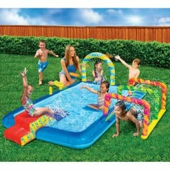 Challenge your friends to some refreshing summer games with the Obstacle Course Activity Pool from Banzai! Start by making a splash as you slide into the pool before racing through the water-spraying arch. Crawl through the water-spraying tunnel and finish the course with a friendly game of ring toss. Victory will be yours all summer long! Features a slide, water-spraying arch, ring toss and sprinkling crawl activities. Refreshing continuous sprinkling action by easily attaching to any garden hose. 4-in-1 backyard activity fun includes two inflatable rings. Measures 108 x 88 x 34 in. Durable PVC construction. Model: G191124209100.