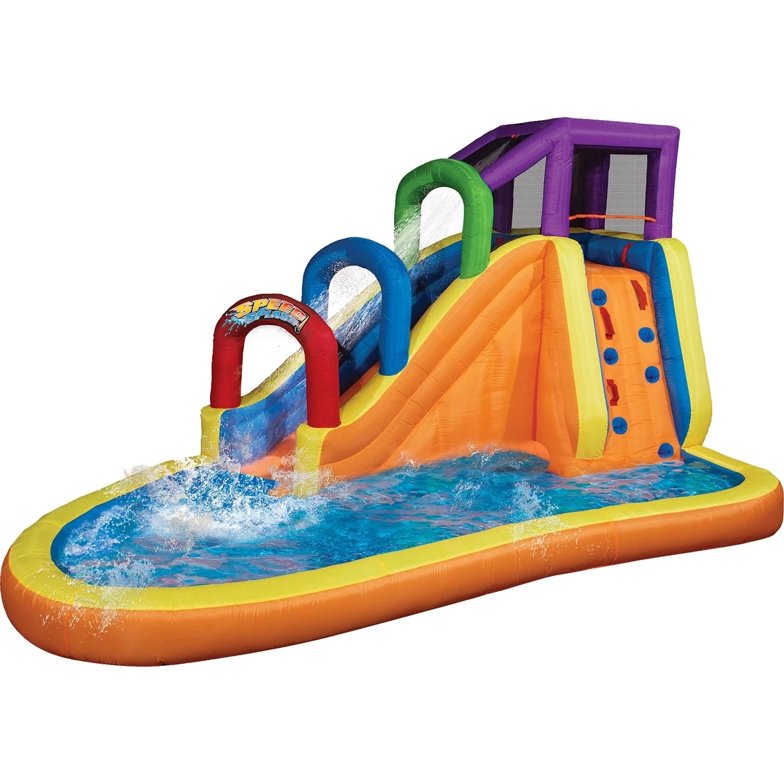 Rev up the fun this summer with the Speed Slide Water Park! Make your way up the climbing wall and take a deep breath before racing under the colorful arches and landing with a giant splash. With the included continuous airflow blower, all this fun inflates in under 2 minutes. It’s water park fun in your own backyard! This Speed Slide Water Park has a slick slide with a safe bottom landing pad. The water spaying arch keeps you wet on the way down. Climb up and plunge into fun!