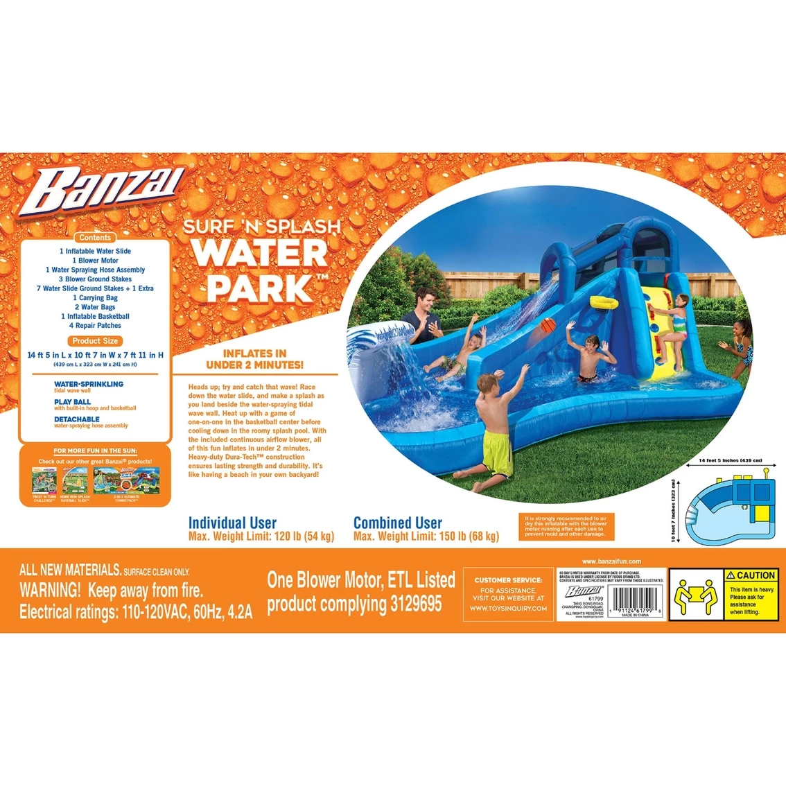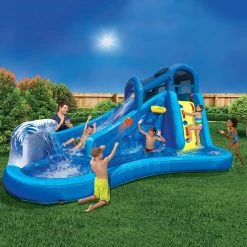The ultimate backyard water park. Heads up-try to catch that wave! Race down the water slide for a splash landing beside the water -spraying tidal wave wall. Heat up with a game of one-on-one basketball and then cool off in the pool. Cushioned slick slide and splash pool with basketball hoop challenge.