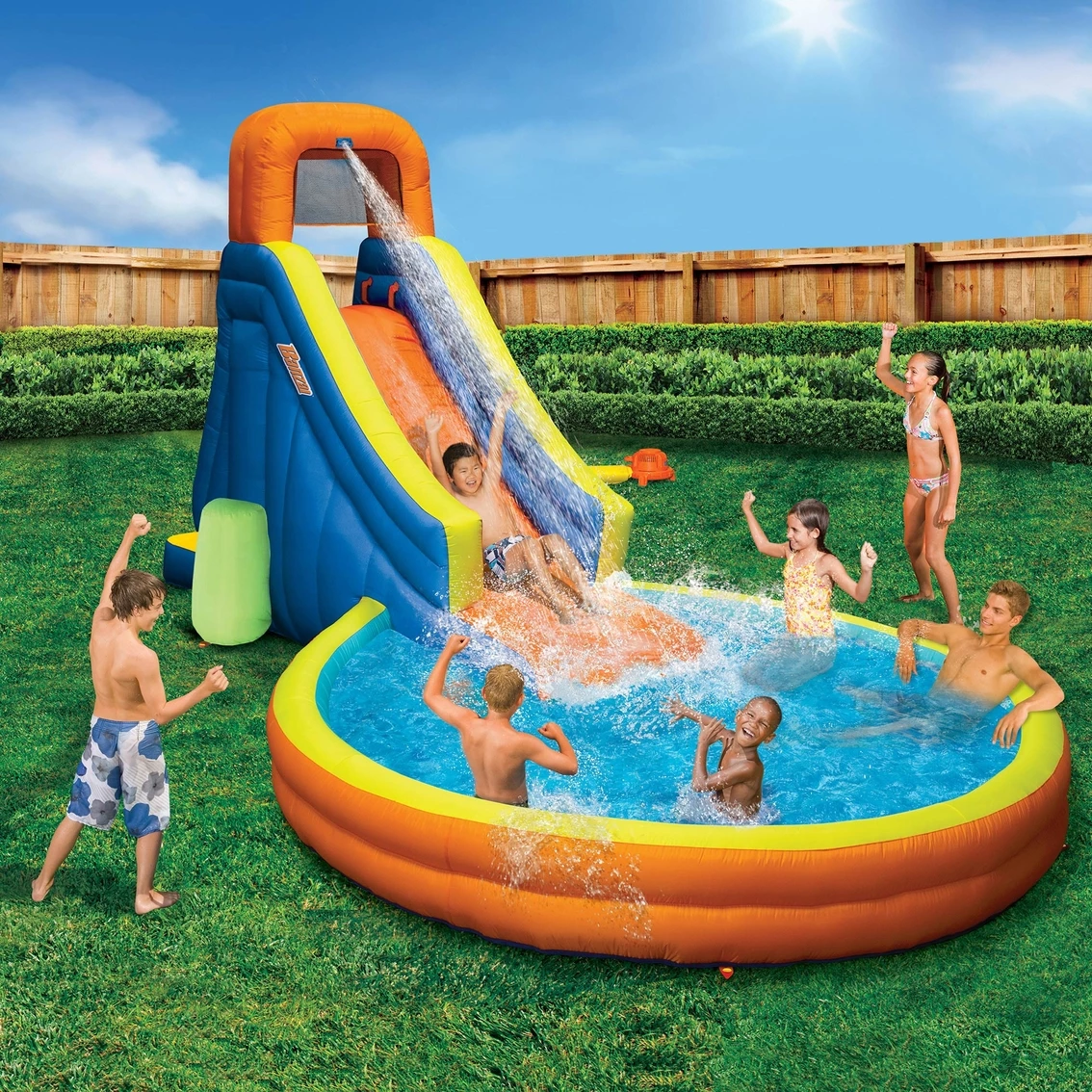Deep Plunging water slide into the giant splash pool! Refreshing overhead sprinkler and detachable water spraying hose.
