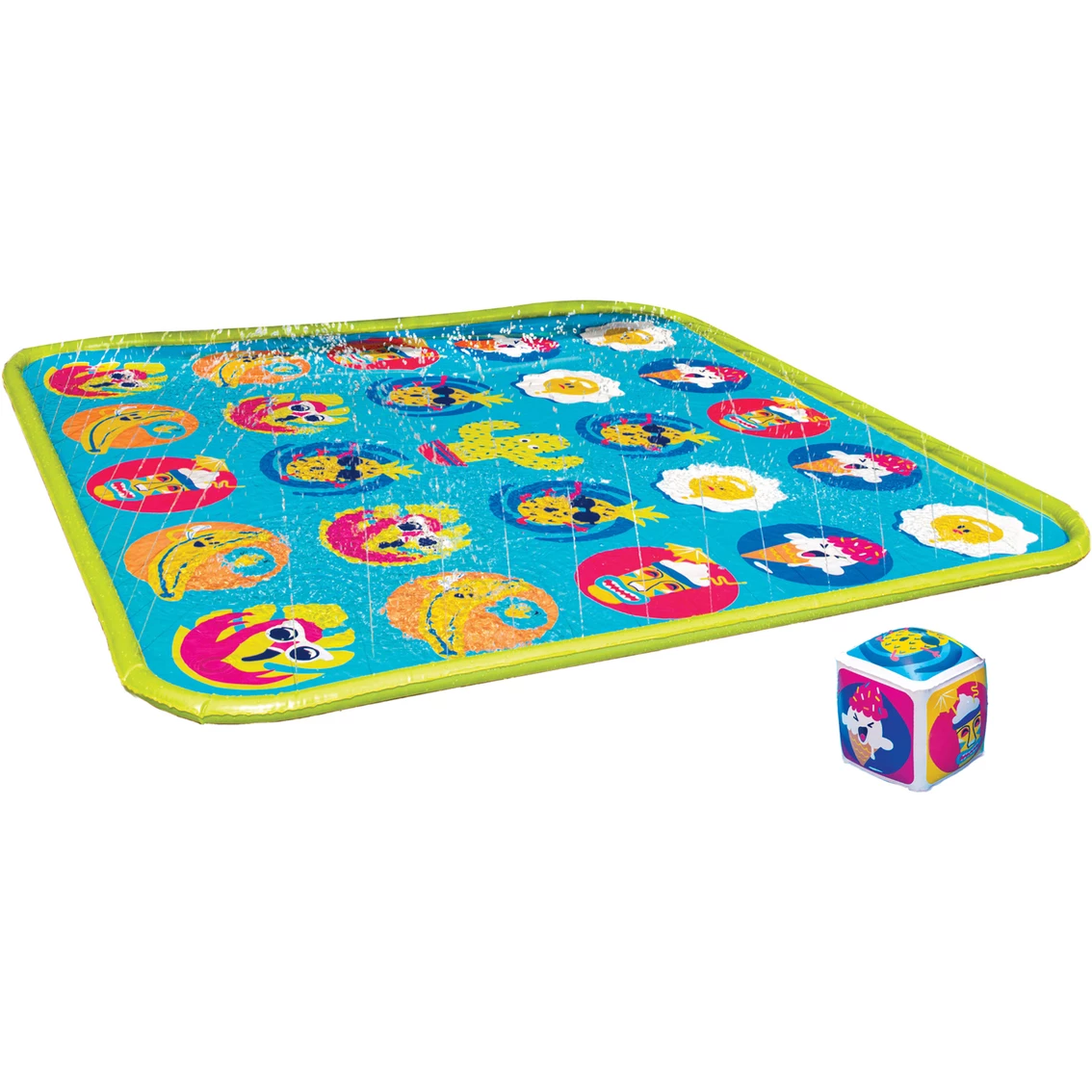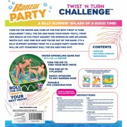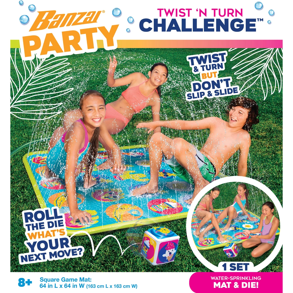 Turn on the water and turn up the fun with Twist ‘N Turn Challenge from Banzai! Roll the dice and make your move. You’ll twist and reach as you fight against the sprinkles and splashes. Watch out! Twist and turn but don’t slip and slide or you’re out of the game. It’s a silly, slippery summer twist to a classic party game! Who will be left standing? Roll the dice and find out. Comes with game mat, one inflatable game die and repair patch. A special summer twist to a classic game! Perfect beach, backyard, BBQ fun! Toss the dice and find your next move. Fun for up to 4 players. Easily attaches to garden hose. Mat is 64 inches square. Model: G191124302115.