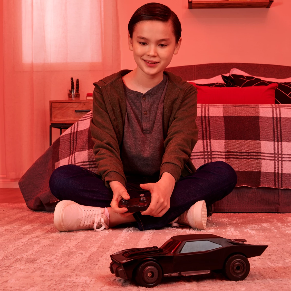 Race into action with the Batmobile RC in 1:20 scale! The remote control Batmobile features an easy-to-drive remote control, authentic The Batman movie styling and incredible details that bring your Batmobile to life. The Batman Batmobile is easy for kids to drive! The 2.4 GHz dual joystick remote control is USB rechargeable and features out-of-range sensors so you’ll know when your Batmobile needs to stay in range, recharge, and can speed into action again.