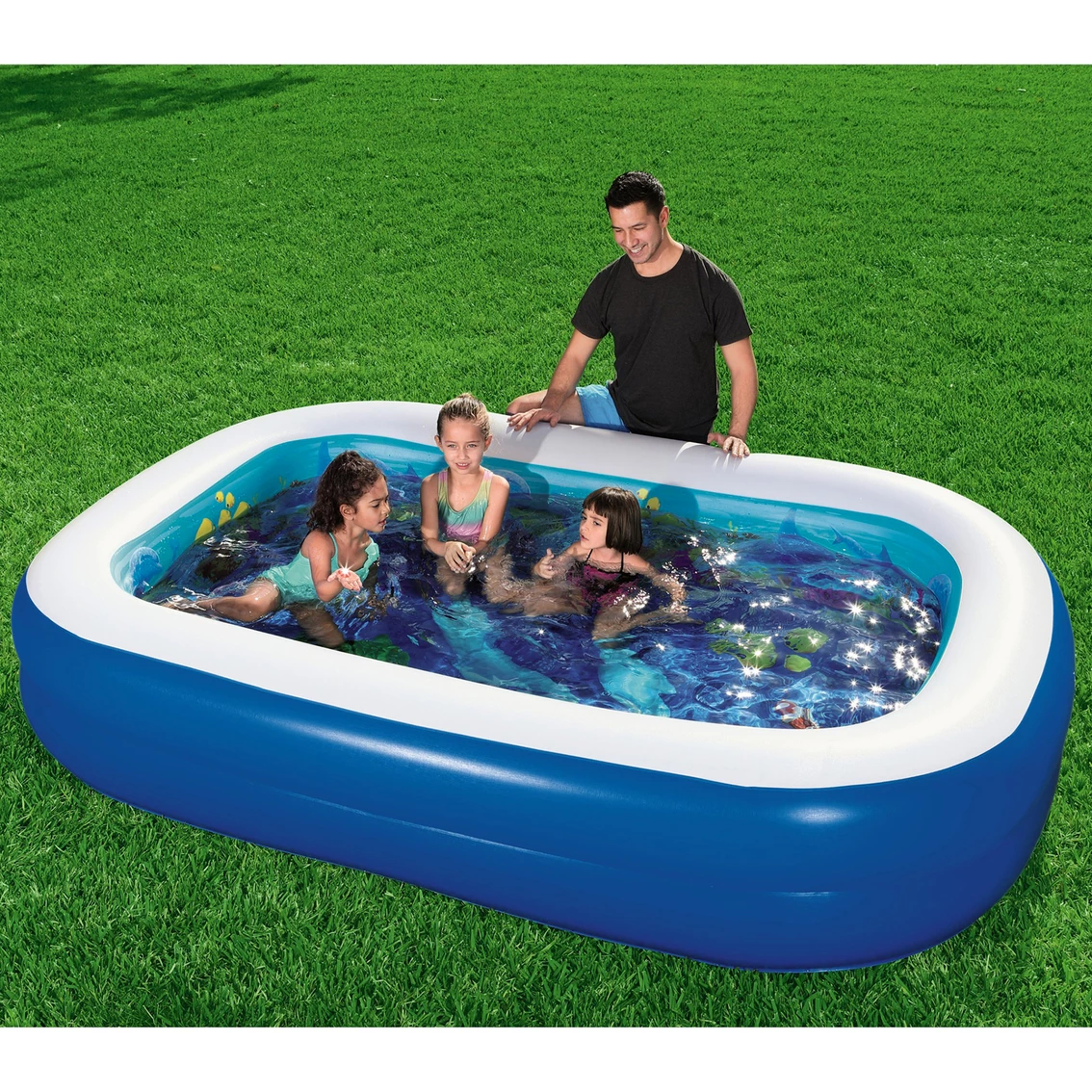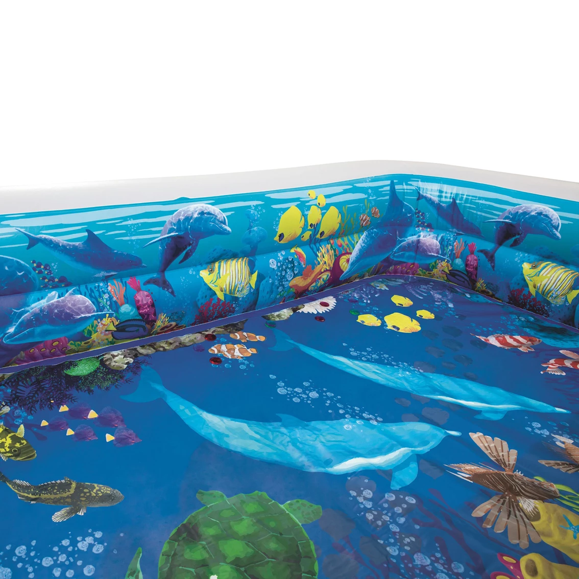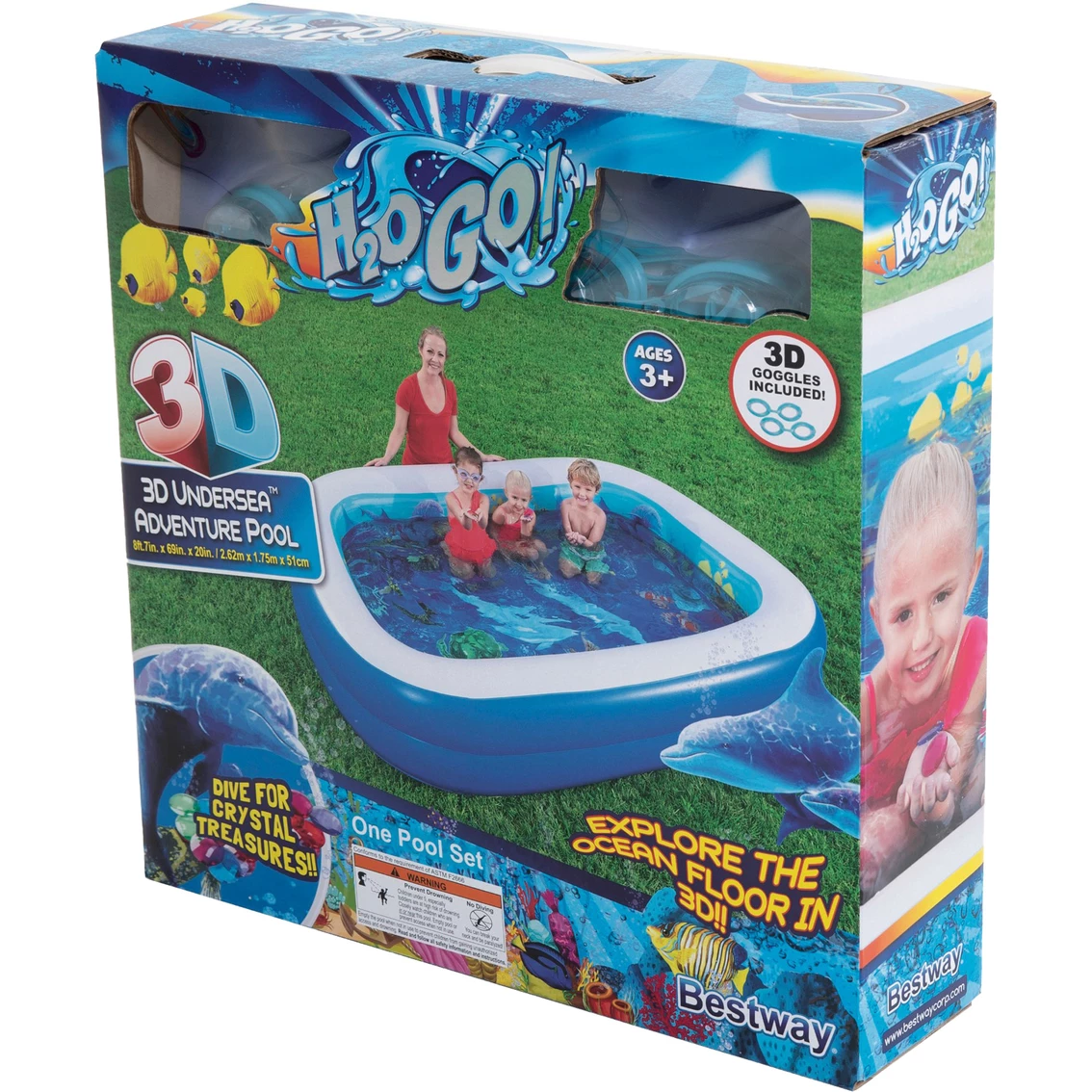 Designed to get kids moving, grooving and out of the house, the H2OGO! 3D Undersea Play Adventure Pool is quality-tested and puts the focus back on fun! With 2 equal rings, 2 interconnecting nozzles and extra wide side walls, this is the perfect pool for kids. The pool includes 2 sets of 3D goggles and a handful of crystal treasure so kids can go on their own treasure hunt in their own backyard. When you are done with the pool, the water easily releases with the easy-to-use drain. The pool can also be used without water. Playing in the sun has never been more fun than with the H2OGO! 3D Undersea Play Adventure Pool. Recommended for ages 3 and up. Measures 8 ft. 7 in. x 69 in. x 20 in. Model: G0821808541775.