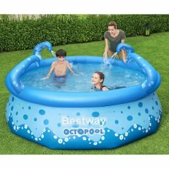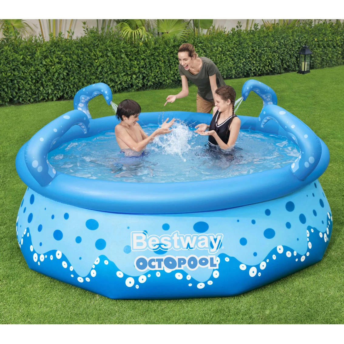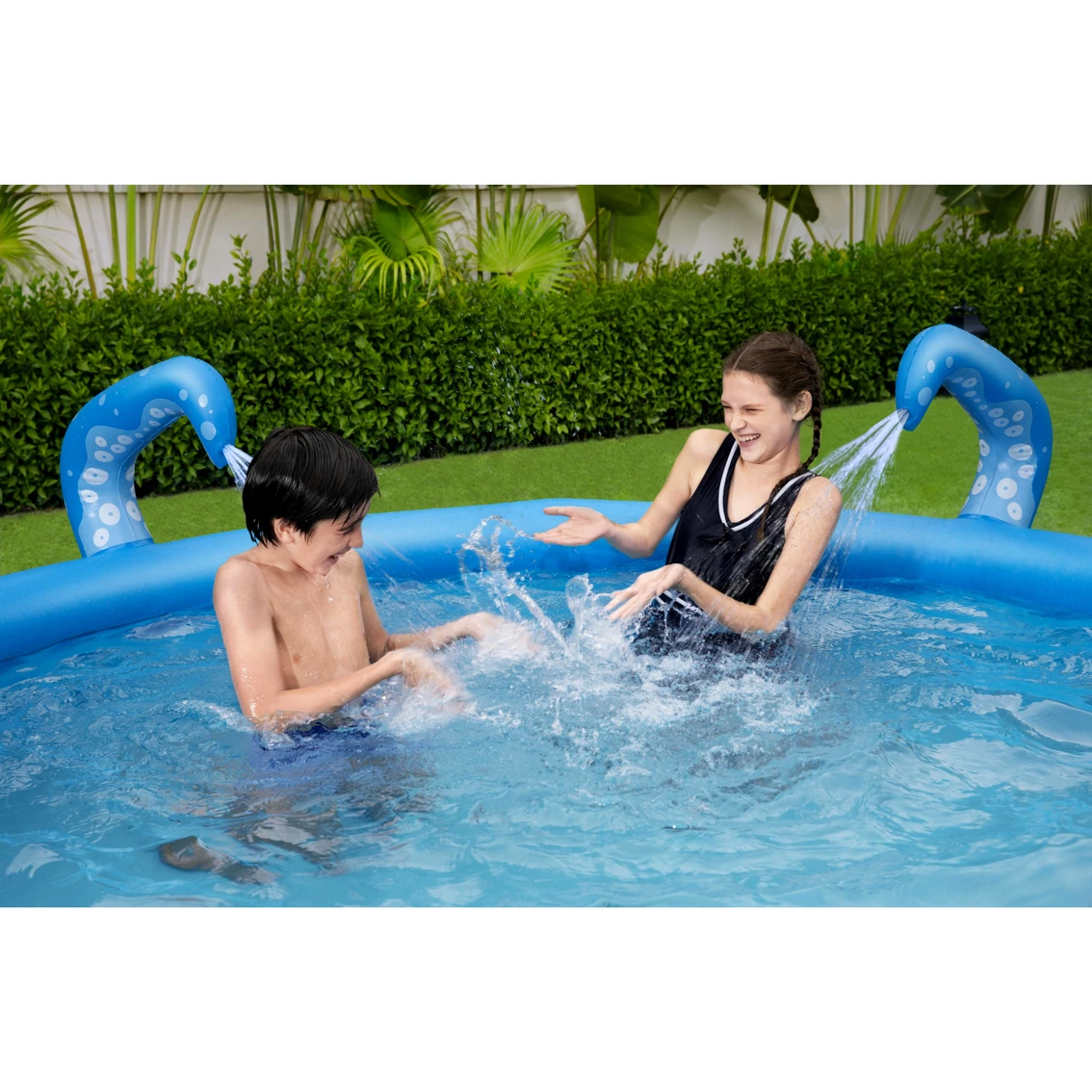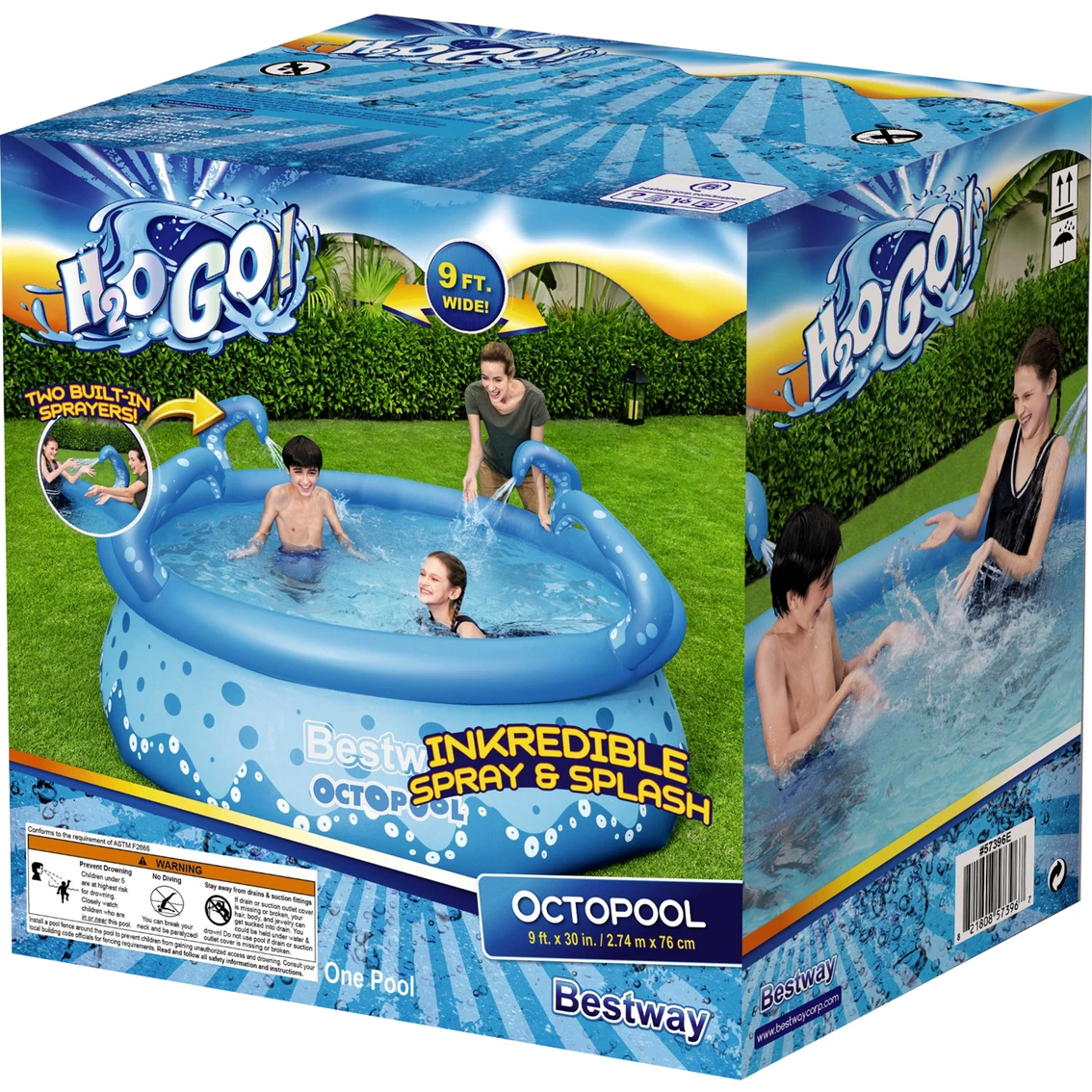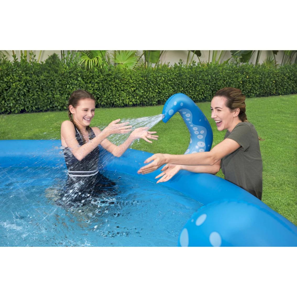 The H2OGO! OctoPool is a fun twist on the traditional Bestway Fast Set pool. With an inflatable top ring, the pool liner rises as it’s being filled with water. All you have to do is place it on a flat, level surface. The OctoPool features four tentacles, two of which are also built-in sprayers for an incredible time splashing in the water! This pool also features Bestway’s Tritech liner, which is an extra durable and puncture-resistant material so the fun can last all summer long. The H2OGO! OctoPool is simple to set up, take back down and easy to store during the off-season. Measures 9 ft. x 30 in. Model: G0821808573967.