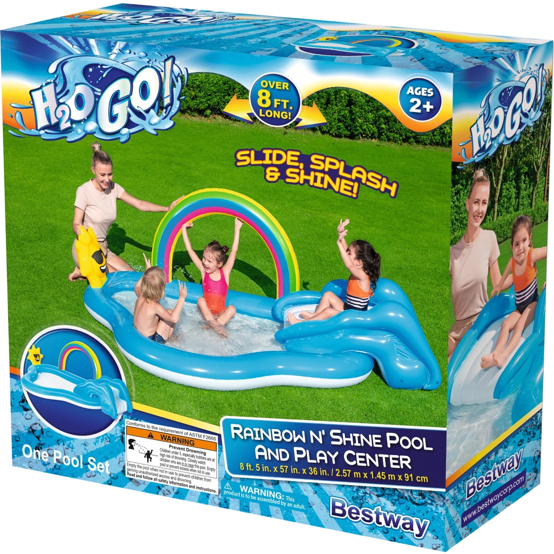 The H2OGO! Rainbow ‘n Shine Play Center is perfect for hours of fun under the sun! With a detachable slide and a cushioned landing area, kids will be begging to go outside and play. Plus, an extra-large pool means a day full of water-filled fun! Attach a garden hose and water will spray out of the sun, adding an extra splash to play time. And when the fun is done, simply drain the water through the drain valve and fold up for easy storage. Model: G0821808530922.