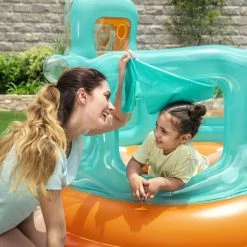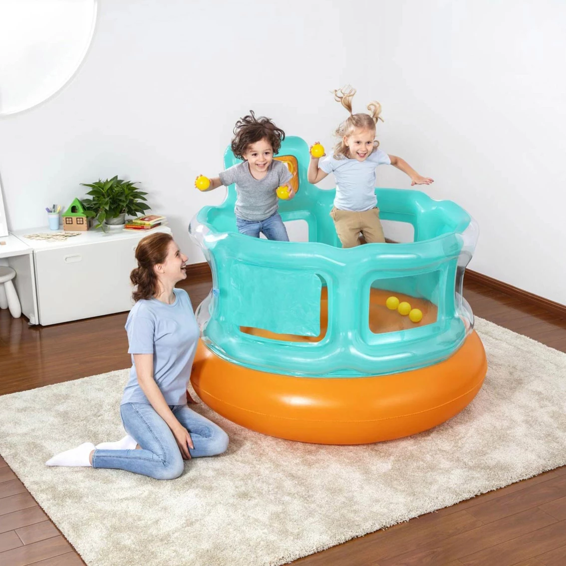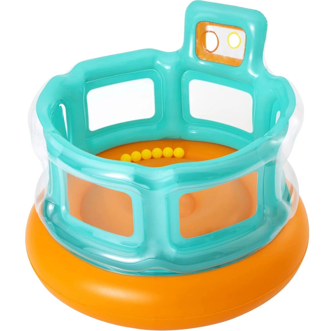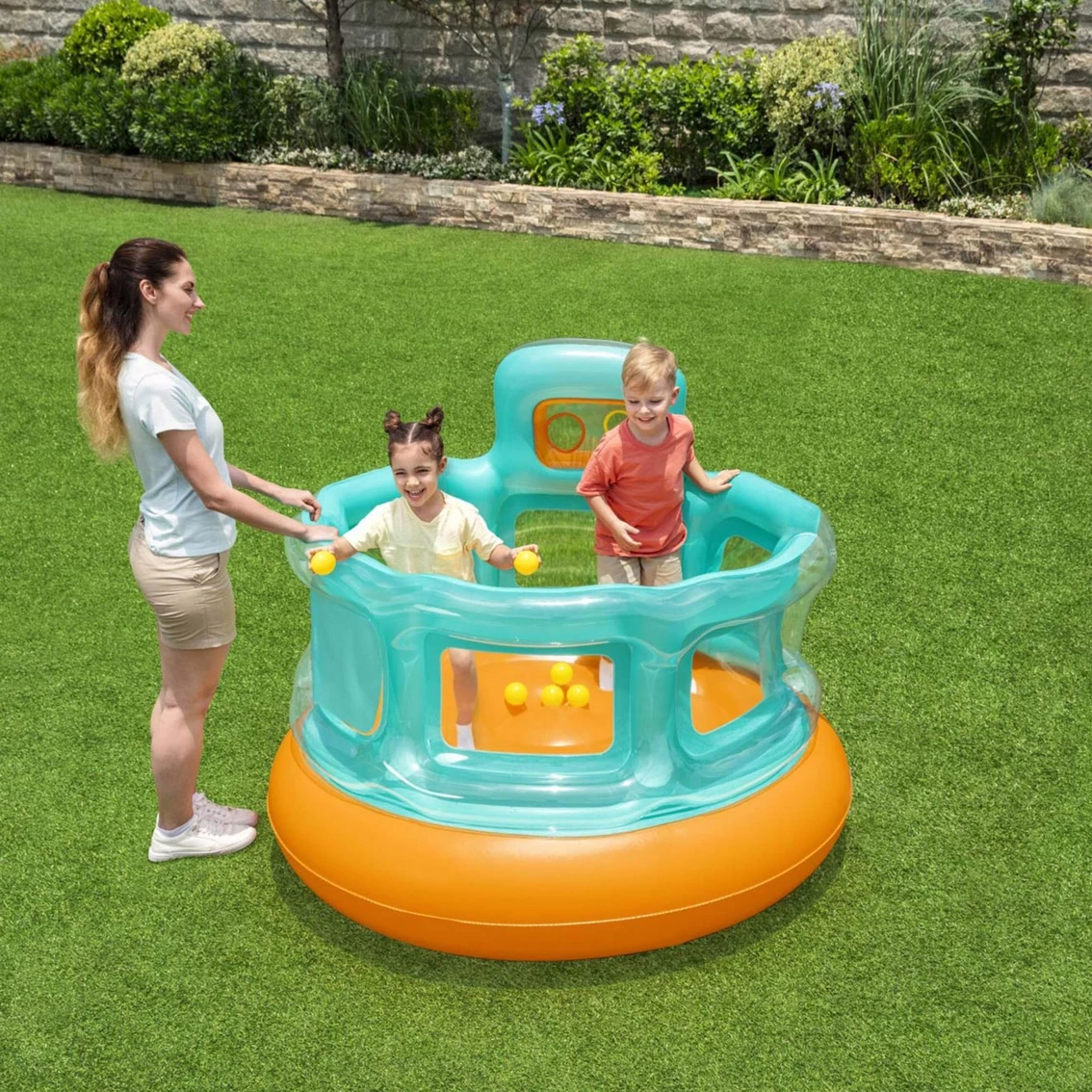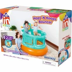 Kids will jump at the chance to bounce the day away in the Up In & Over Hops ‘N Hoops Bouncer! This bouncer features a fun ball toss game, which includes 6 play balls. Plus, the single entryway adds an extra safety element for kids as they jump and play! The Hops ‘N Hoops Bouncer can be used both indoors and outdoors, providing hours and hours of fun all year long.
