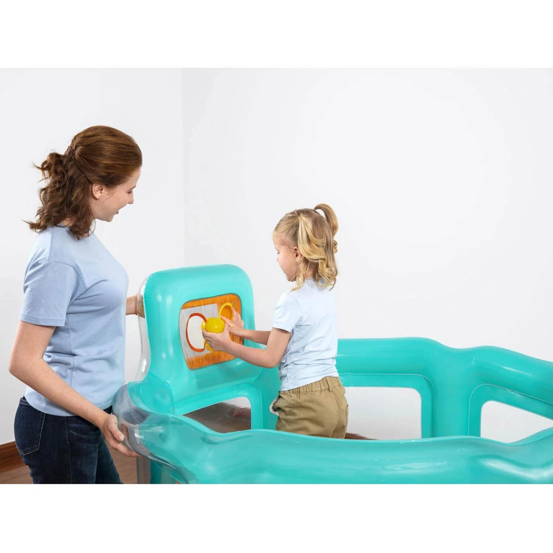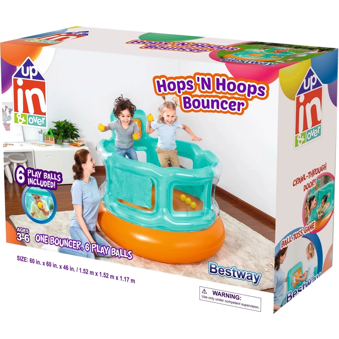 Not only will kids be having a blast as they play in this bouncer, but they will also be developing motor skills, hand-eye coordination and dexterity. Make your child’s day with the Up In & Over Hops ‘N Hoops Bouncer! Suitable for ages 3-6 years. Weight capacity of 121 pounds. WARNING: Use only under competent supervision. Keep away from fire and flame. Model: G0821808523443.