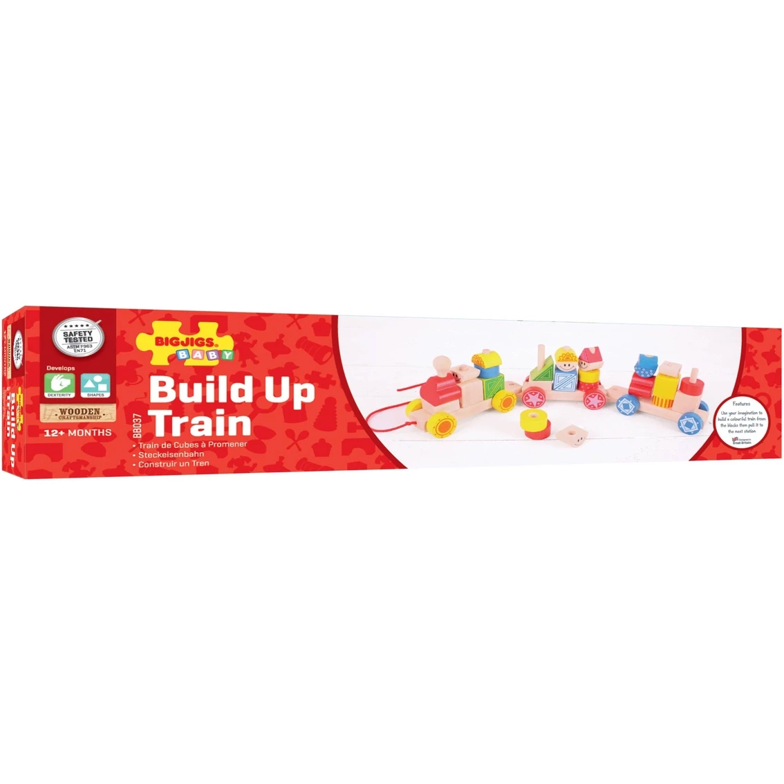 Two great toys in one. Creative little minds will love building up the vibrantly detailed wooden blocks to form the engine and carriages of this Build Up Train from BigJigs Toys. Once assembled, it is time to take the show on the road, in the form of a twisting, turning, pull-along train. Every play session represents a unique experience as there are so many different ways the train can be configured. Encourages mobility. Helps to develop dexterity and co-ordination. Made from high quality, responsibly sourced materials. Conforms to current safety standards. Age 1+ years. Consists of 28 play pieces. Model: 197857.
