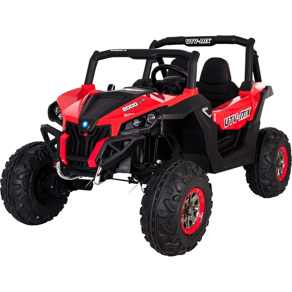 Your little driver can zoom around with a friend on this 12V two seat battery operated Blazin’ Wheels Red Wild Cross UTV. This vehicle will drive in forward and reverse. Features music, engine sound and horn. Working front lights and 4-wheel suspension, Side doors can be opened. High/Low speed adjustment. Minimum speed: 1.86 mph. Maximum speed: 4.35 mph. Model: XMX603R-EVA.