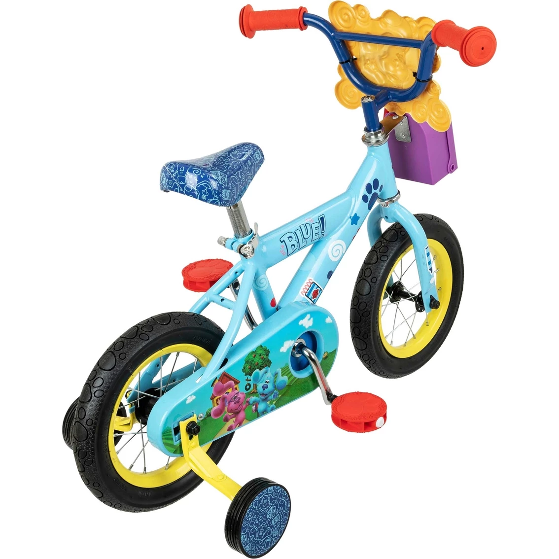 Learn to ride with Blue! The Nickelodeon Blueโs Clues kids bike is perfect for young kids just learning how to ride. It comes with a durable steel frame, easy-to-use single-speed drivetrain, and an intuitive rear coaster (pedal) brake for secure stops. Plus, removable training wheels are included to provide extra support while your child learns to ride. But best of all, this sidewalk bike is decked out from top to bottom in authentic Blueโs Clues & You graphics and details. It even features a Blue handlebar plate and mailbox storage compartment. Learning to ride is tons of fun with the Blueโs Clues kids bike. Model: S0208.