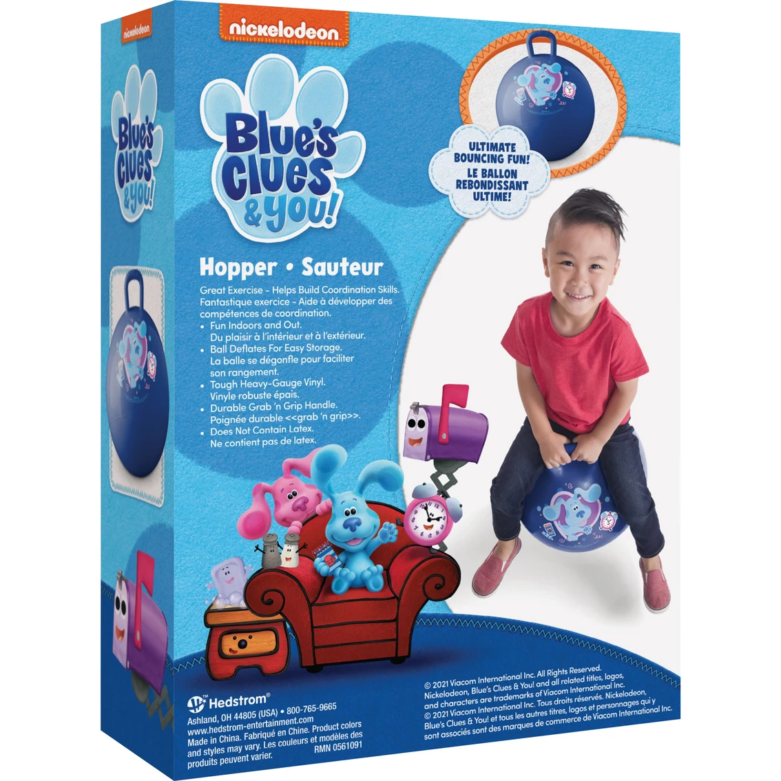 Hedstromβs Hopper Ball from Blues Clues will be one of your childβs favorite toys! Watch them bounce and hop all around the house and yard. This Hopper Ball is a great source of fun exercise for children, developing key cognitive skills for their future. This Hopper Ball has an easy grip and grab handle, providing safe, exciting and unplugged fun! Can be used indoors or out. Promotes coordination and exercise for ages 4 years and up. Weight capacity of 100 pounds. Warning: Choking Hazard — Small parts. Not for children under 3 years old. Model: G0033149153023.