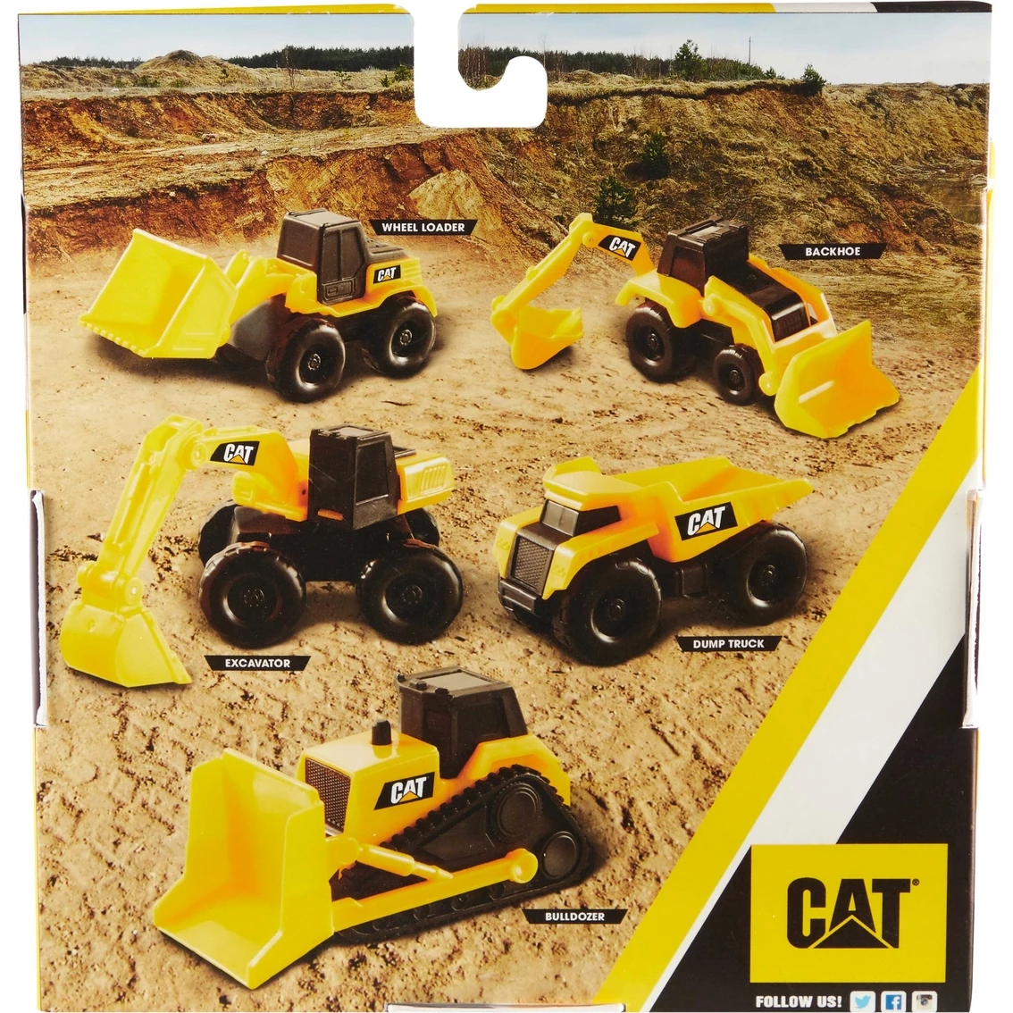 The CAT Little Machines 5 pk. are 3 in. of free wheeling construction vehicles. The set includes Backhoe, Dump Truck, Scoop Shovel, Bulldozer and a Front End Loader. Model: 23008210.