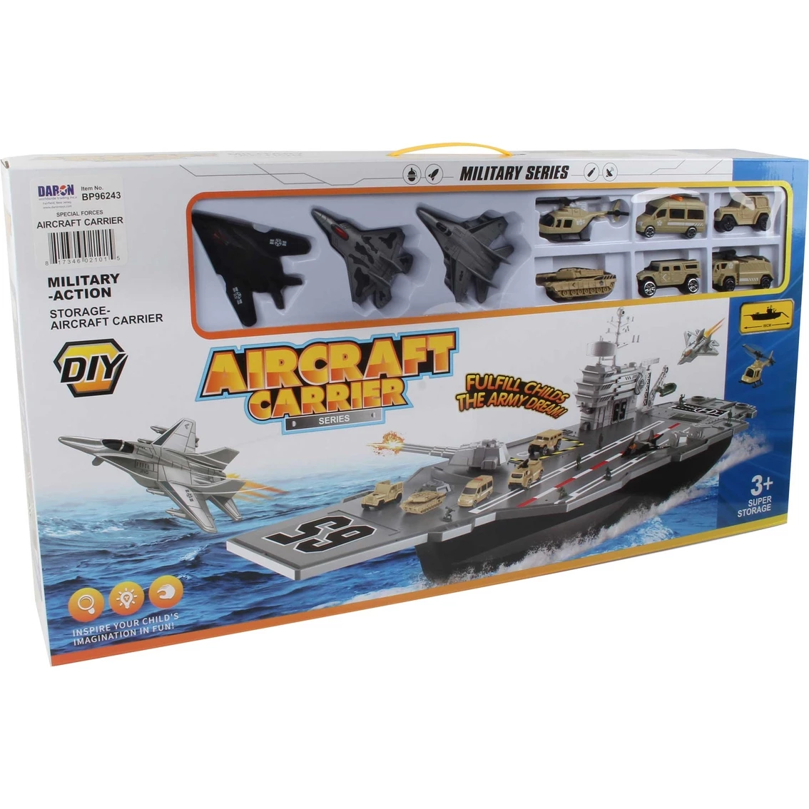 This plastic Daron Aircraft Carrier Playset comes with three plastic planes, four plastic vehicles, one plastic tank and one plastic helicopter. Aircraft carrier is 34 inches long. Includes two action figures. Recommended for children ages 3+. Model: BP96243.