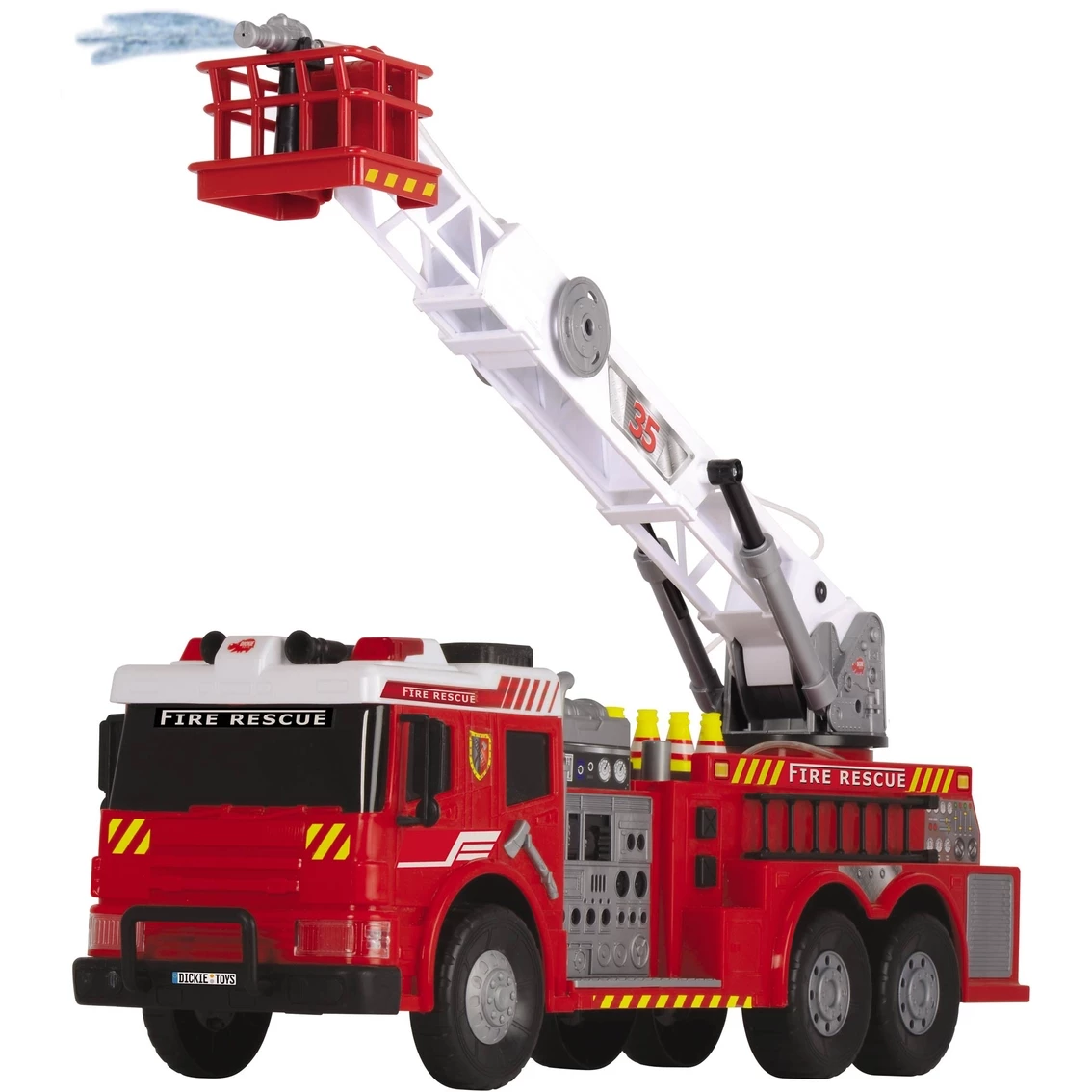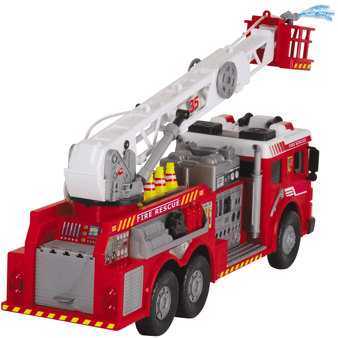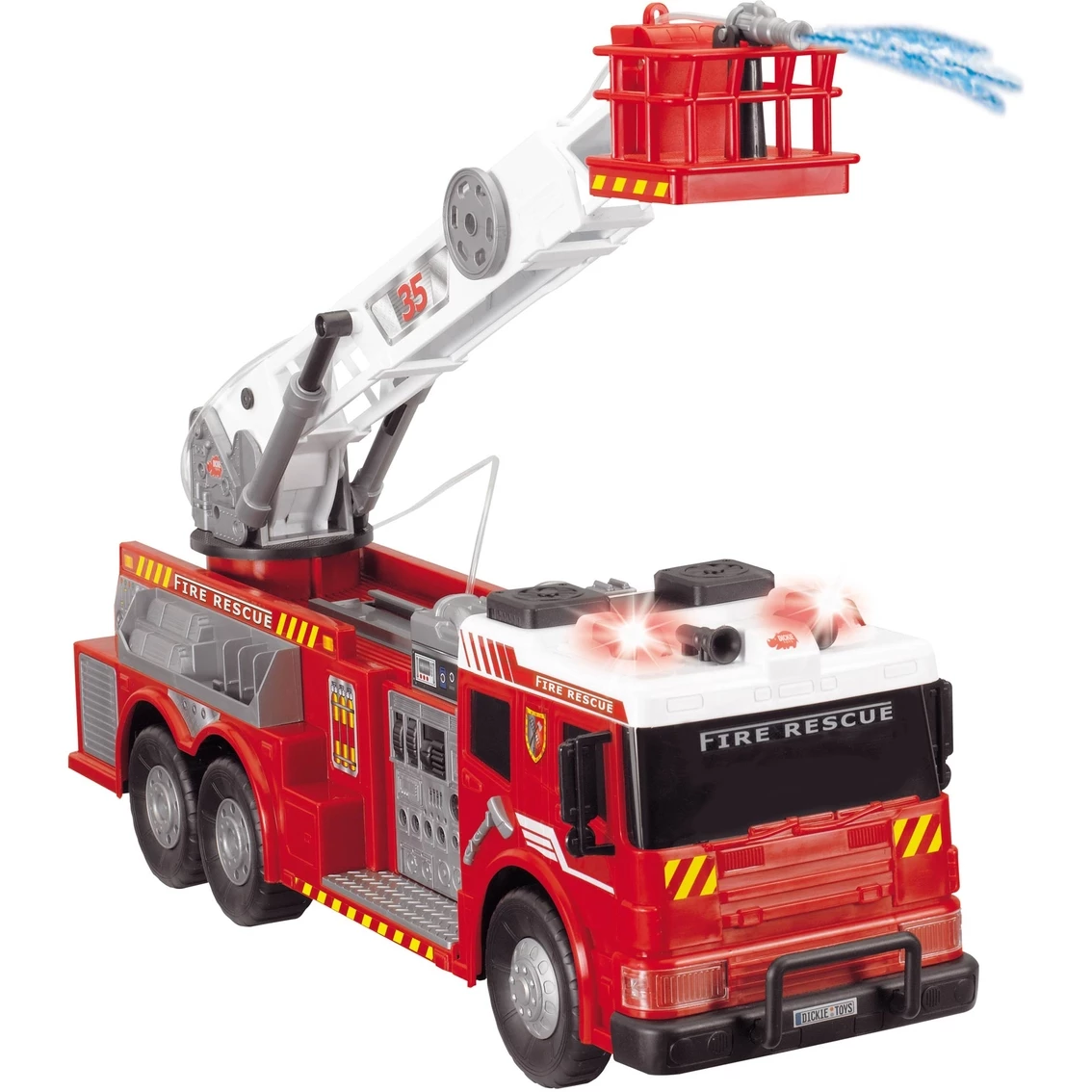 At over 2 ft. in length, this jumbo Fire Rescue Brigade truck from Dickie lives up to its name. With its button operated flashing lights, sirens and manual pump-action water pump, this Fire Brigade provides endless hours of firefighting rescues. Truck also features many moving parts and a variety of firefighting accessories.