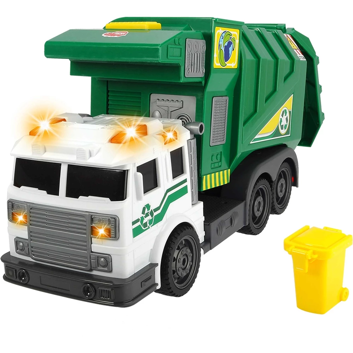 Dickie Toys Action City Cleaner: recycling is great fun! It’s not just the cities where waste management plays a key role. This toy truck is modeled closely on real road vehicles with all their familiar functions! The truck comes with a dustbin that is raised by a lift on the side of the vehicle and the contents are tipped into the large loading area. It has an opening tailgate to allow the rubbish to be emptied at the play rubbish tip. With light and sound effects at the push of a button, young street cleaners can experience fun with all their senses at the same time as learning how vehicles work. 2 AA batteries are required and included. Recommended for ages 3 and up. WARNING: CHOKING HAZARD — Small parts. Not for children under 3 yrs. Model: 200887.