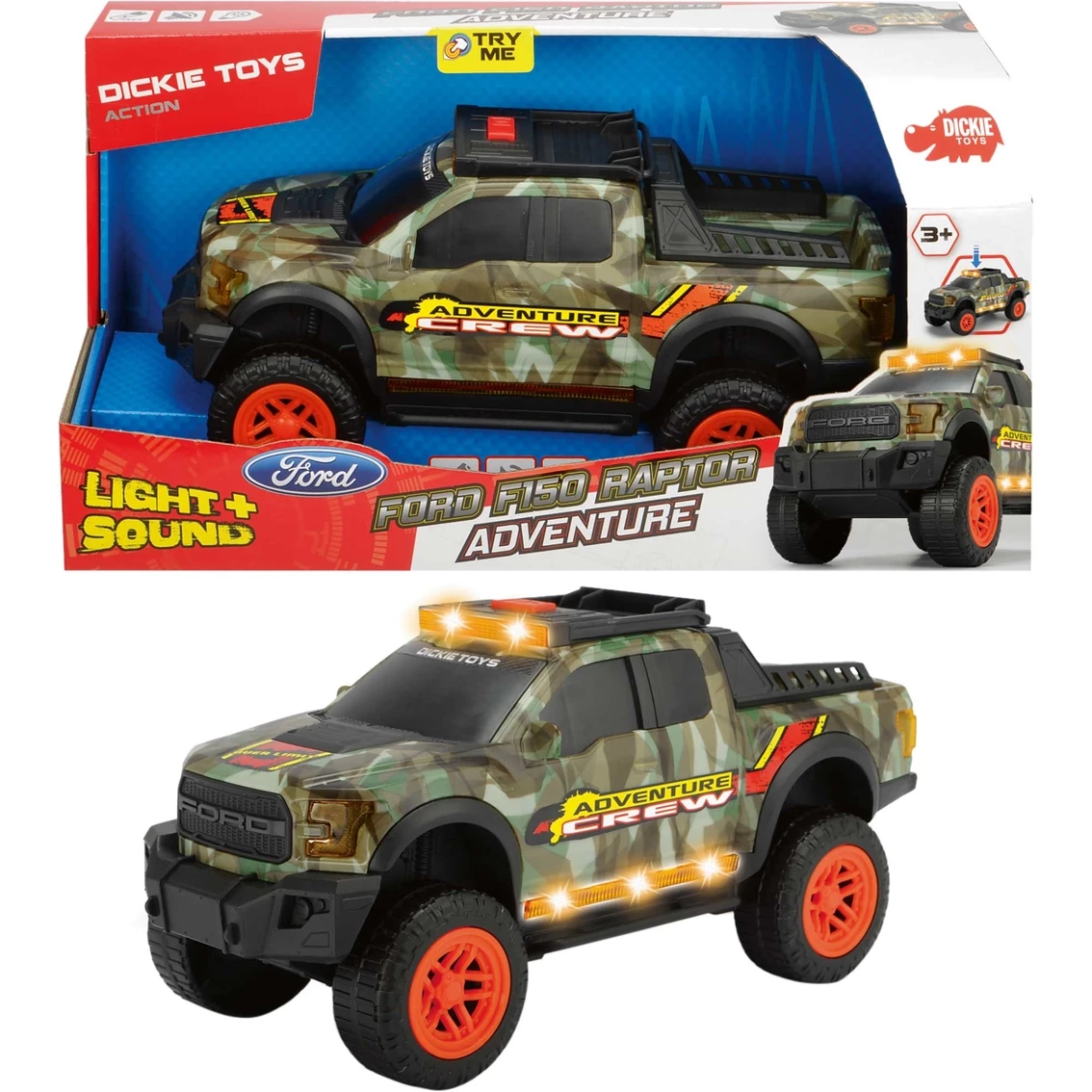 The Ford F150 Raptor Adventure takes off! This toy version of the famous Ford F150 Pick Up Truck races ahead of the original in several ways. The highlights are the light and sound effects: a horn, engine sounds and even music. With a new developed method of applying color to the bodywork, Dickie Toys has ensured that each bodywork has an individual design. This makes your Raptor unique! Through its cool camouflage look, the Ford F150 Raptor Adventure will turn your child’s room into a landscape full of adventure. Thanks to the Try Me function, the batteries are already inserted and you can start right away! Recommended for ages 3 and up.