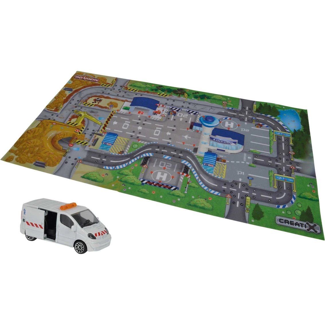 This quality Majorette playmat from Dickie Toys is just what you need to start building your own little town. The mat is a printed scene to match the Majorette construction theme, so the playroom can be transformed into a pulsating airport with building site. Set comes with one toy car so that the fun can begin immediately. Made from polyester, the playmat is manufactured to a high quality, suitable for playing on floors with underfloor heating, and has an anti-slip coating. Various mats, accessories and road sections (sold separately) can be laid next to each other on all sides. So there’s plenty of scope to create all kinds of imaginary worlds in the play room, with no limits to the imagination. Approximate dimensions: are 38 in. x 20 in. Age – 5 and up. WARNING: CHOKING HAZARD — Small parts. Not for children under 3 yrs.