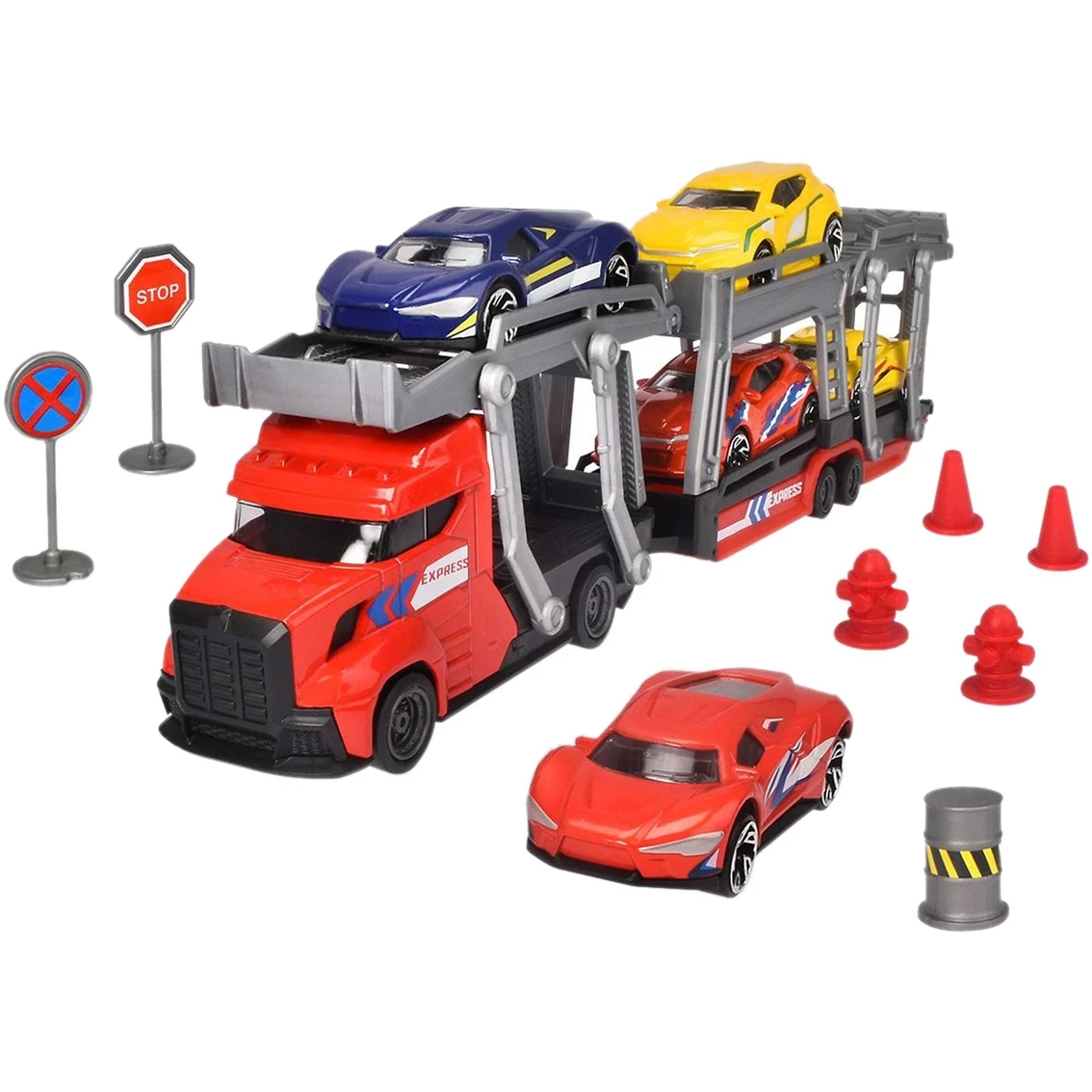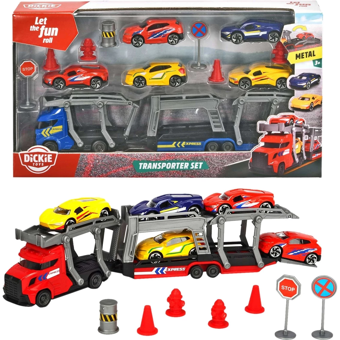 Let your little transport truck driver get a taste of the real thing with this die-cast car playset from Dickie Toys. Moving components give the toy a realistic touch.