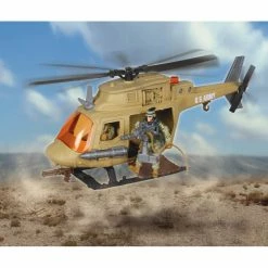 This helicopter playset from Excite has lets kids re-enact full combat arenas. Includes two 3.75 in. poseable soldiers, helicopter with heavy weapon, play accessories and weapons. Recommended for ages 4 and up. Model: 5663.