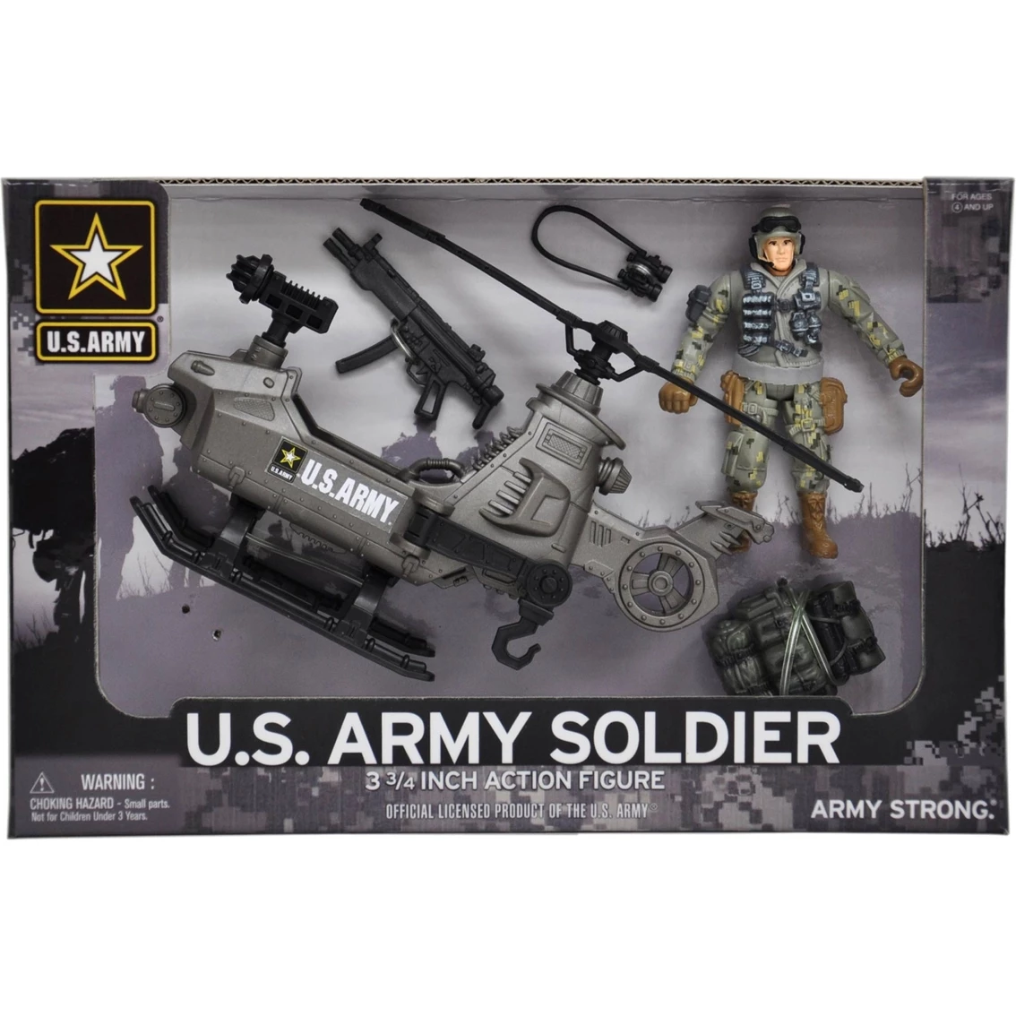 Take to the skies with this U.S. Army Helicopter Playset from Excite. It includes one 3.75 in. soldier in full combat gear, one 6.5 in. mini-helicopter with turret, one light machine gun, one backpack and one binocular. Recommended for ages 4 and up. Model: 5339.