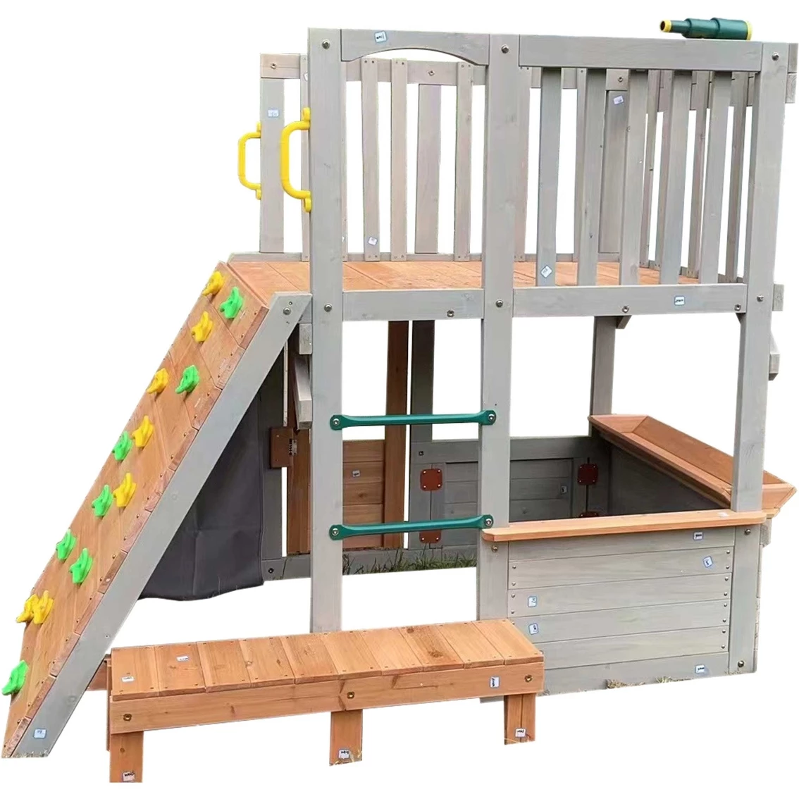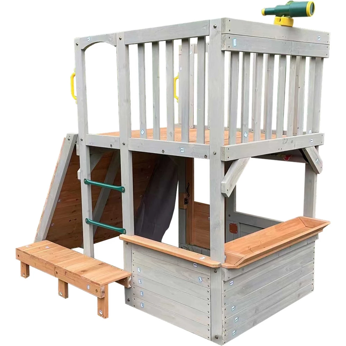 The top level is accessed via the sturdy ladder or the climbing ramp with stepping stones — that should keep the grown-ups out! Little ones can watch out for bad guys through the telescope, just like real guards. In the den below, kids can play in the sandbox or crawl and chase through the doggie door. The wooden door, window shades, and bench make for a cozy home!