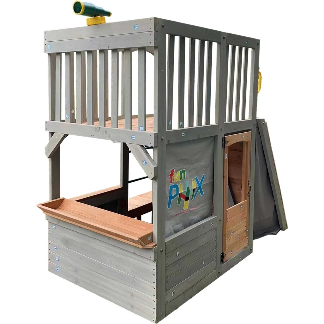Funphix Lookout Post Wooden Playhouse inspires pretend play and outdoor fun! It’s the buildable structure that kids can climb on, scramble under, and roleplay in. Designed with 2 levels, it features an elevated lookout platform plus a ground-floor hangout zone.