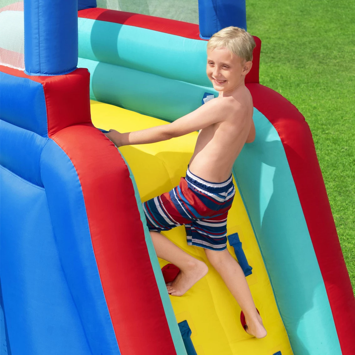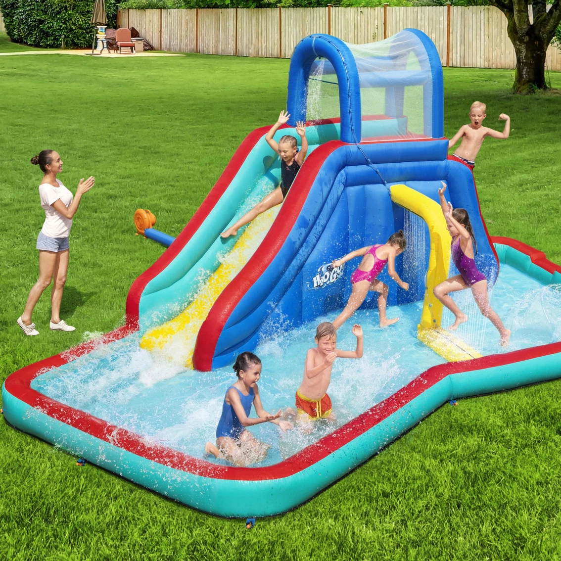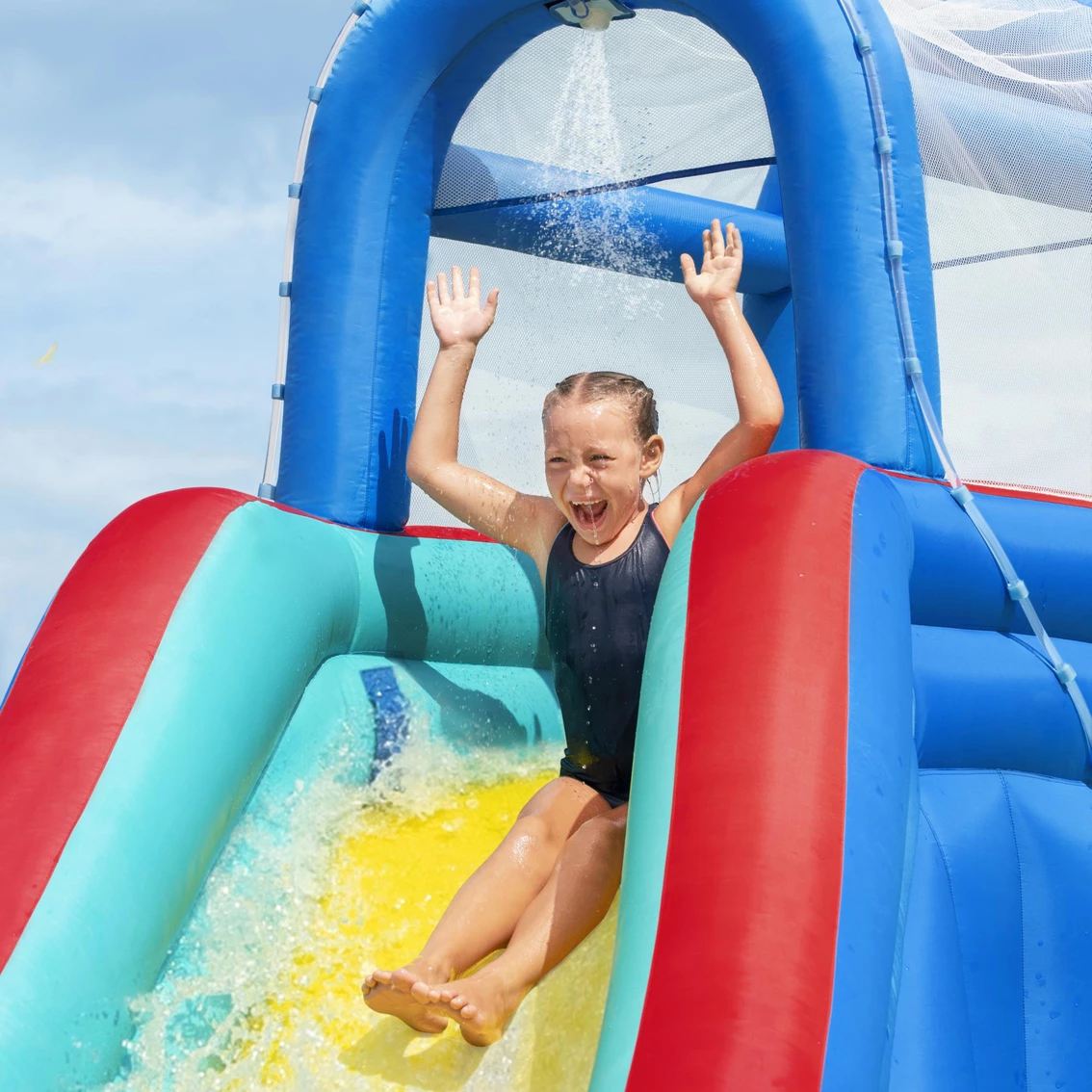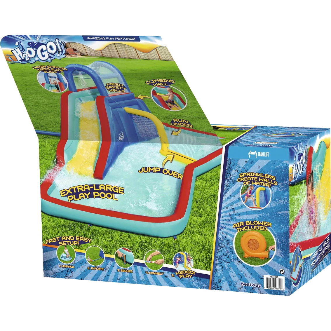 The H2oGo Waterfall Waves Mega Water Park is the ideal backyard play experience for any fun-loving kid. This inflatable water park features a safe and sturdy water slide, a built-in water slide sprayer for constant slippery fun, and 2 giant sprinklers that are fun to duck under or jump over. The slide has a top platform secured by mesh walls to provide parent visibility and help young sliders keep their balance at all times. The climbing wall has safe padded handles and foot holes which make repeat trips up and down easy as can be. The ultra-durable PVC-coated polyester is designed for all day water exposure and dries quickly under the sun. Despite the massive size, setup is a breeze. Simply plug in the heavy-duty air blower and watch the water park inflate in less than 2 minutes! Use the included ground stakes to keep everything in place. Be a neighborhood hero and get the H2OGO! Waterfall Waves Mega Water Park today!
