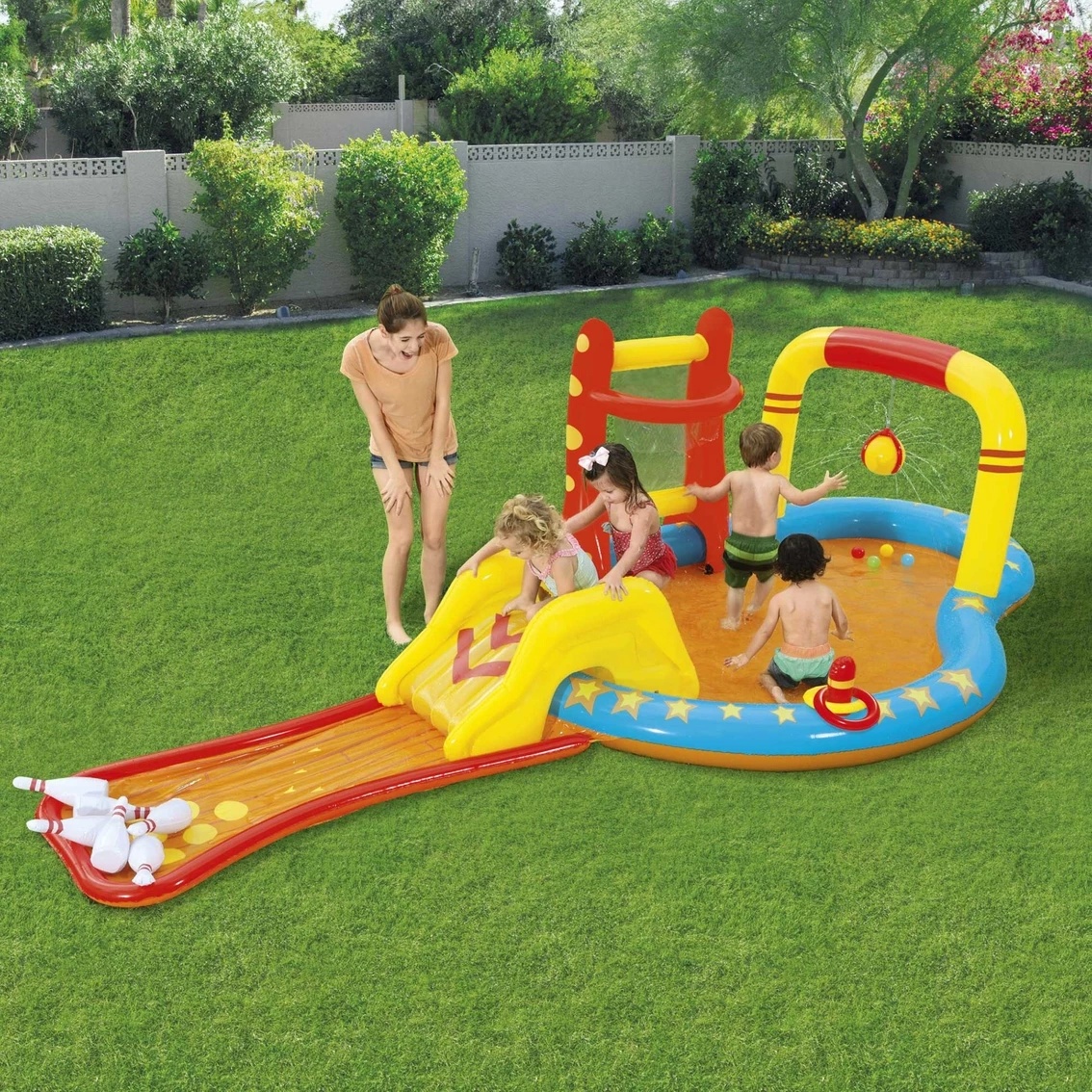 | Includes | One pool,one slide,six bowling pins,one basketball stand,two inflatable rings,4 play balls,repair patch,one pc of water watcher tag. |