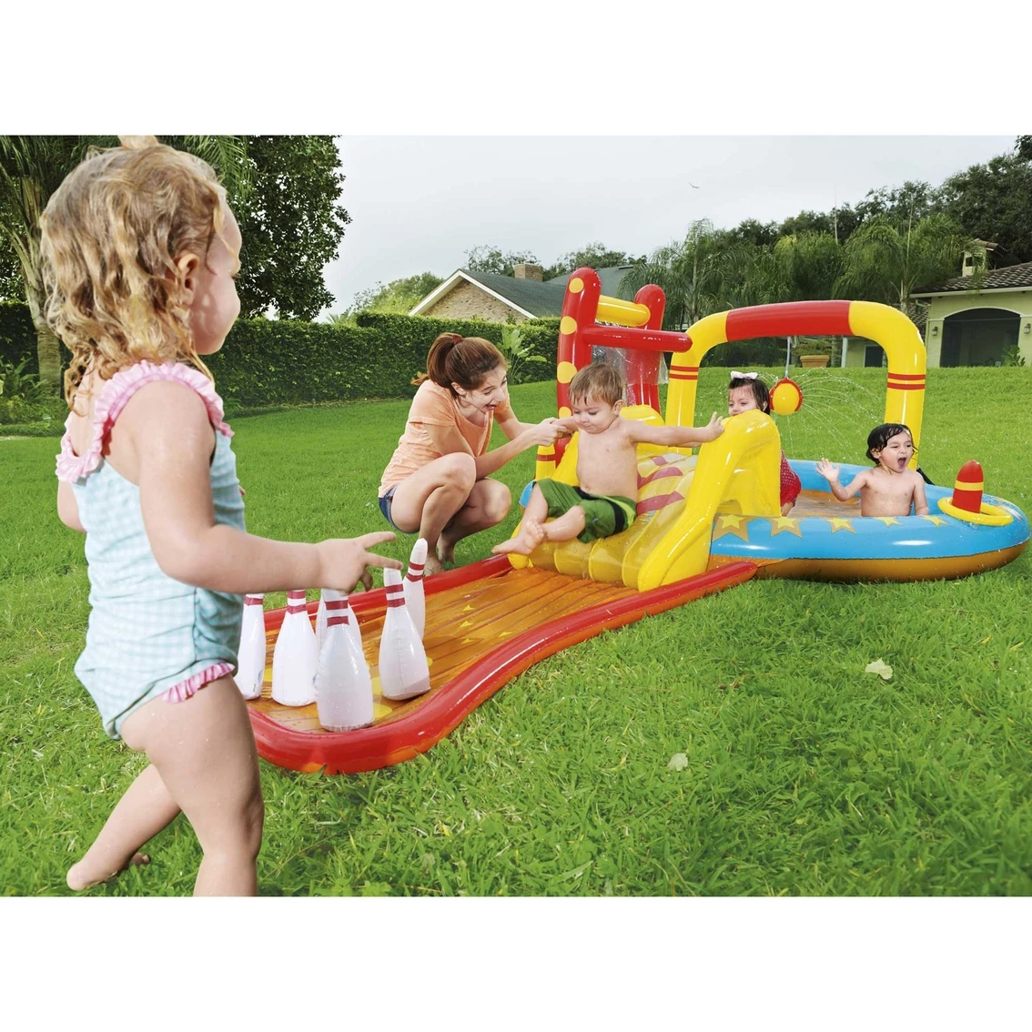 Designed to get kids moving, grooving and out of the house, the H2OGO! Lil’ Champ Play Center is quality-tested and puts the focus back on fun! This play center has it all for a fun day of sports! Bowling, basketball, tetherball and a fun ring toss turn this play center into a mini-waterpark that will keep your kids having fun and keeping score while they play the day away. Also included is a removable slide that can be tied down with tie ropes and grommets. The Play Center comes with 6 bowling pins, 2 inflatable rings, and 4 play balls. The inflatable cushion on the pool floor provides extra comfort for little ones. The water sprayer attaches to your garden hose, keeping your kids cool during the hot summer months! With enough room for friends, splashing in the sun has never been more fun than with the H2OGO! Lil’ Champ Play Center! Model: 53068E.