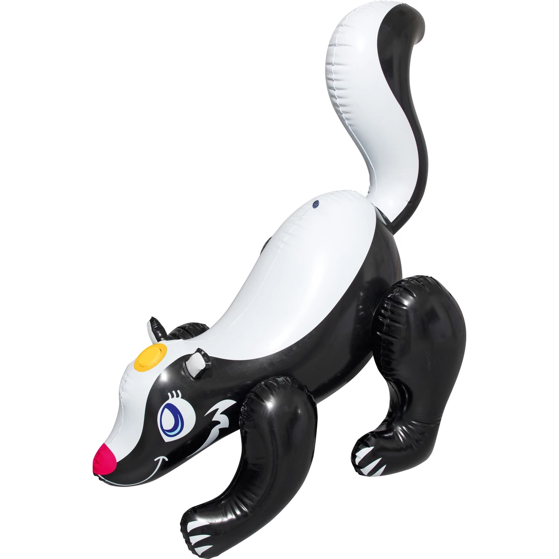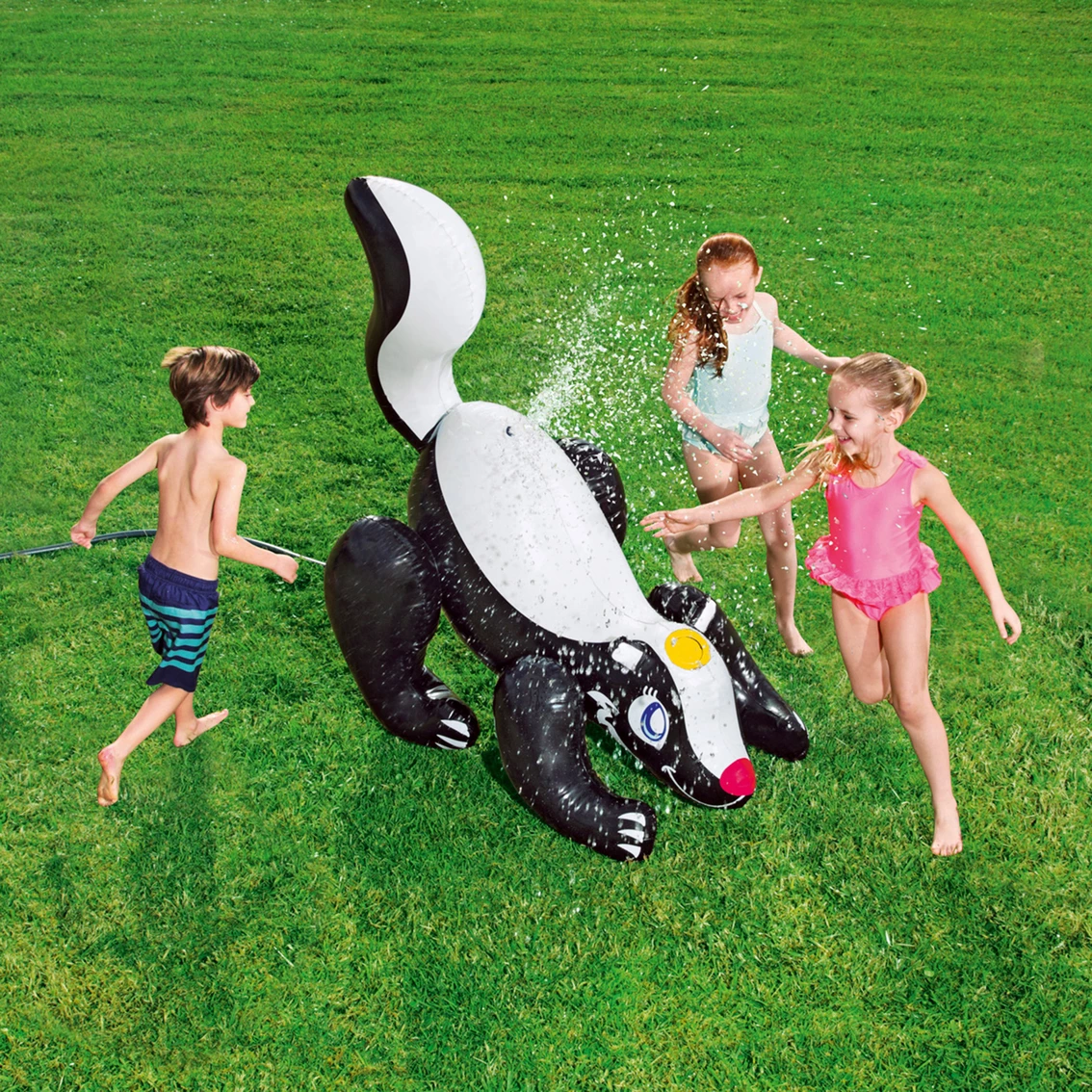 The H2OGO Skunk Spray ‘N Splash Sprinkler is a lively addition to any outdoor play day. Set this skunk-inspired sprinkler up in seconds. Inflate to capacity and then connect a garden hose. Kids can hit the yellow button for an instant water spray! The push-to-spray design is ideal for kids. It helps to conserve water, unlike traditional sprinklers that tend to flood the backyard. The thick vinyl material is sturdy enough for kids to tug on and toss around. This sprinkler includes safety valves and a heavy-duty repair patch to address potential punctures. Model: 52263E.