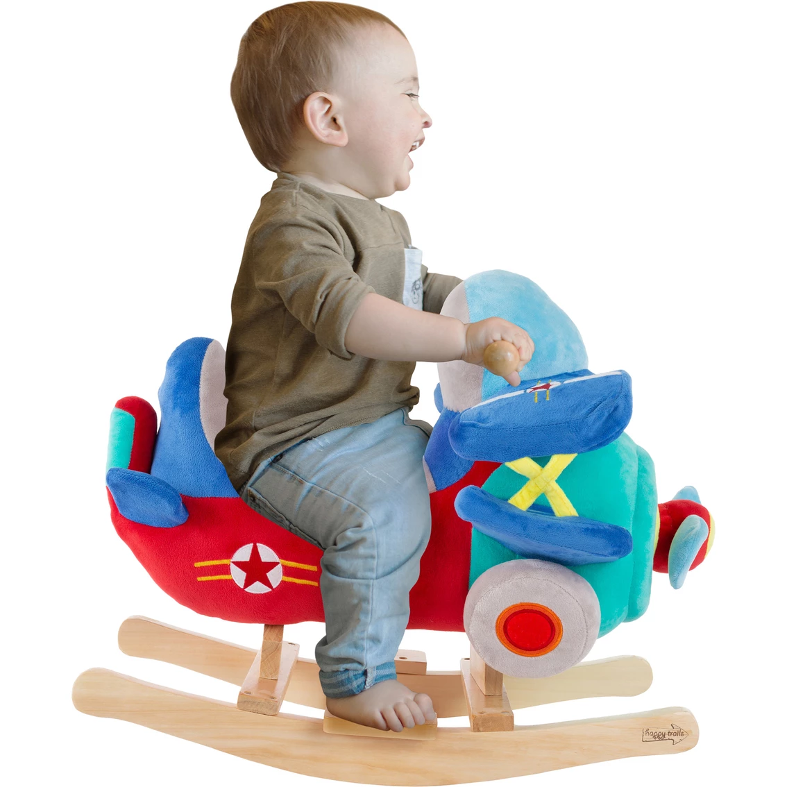 - Plush Friend: The Happy Trails plane is soft and plush to the touch. It is hand-crafted with a wooden core and built on sturdy wood rockers with handles for balance while your little adventurer is pretending to fly their very own plane.