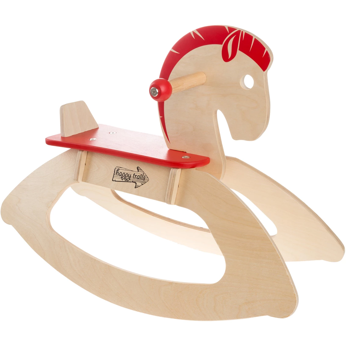 The Wooden Rocking Horse by Happy Trails is the perfect toy to help your toddler develop coordination, strength and basic balance. Ideal for children 1 to 3 years-old, babies can hold on to the handles for stability and can rest their feet on the bottom slats of the rocker or on the floor when they get a bit bigger. This toy features sturdy wooden construction that will stand the test of time, while the neutral red and natural wood design makes it an adorable gift for both boys and girls. Model: M400037.