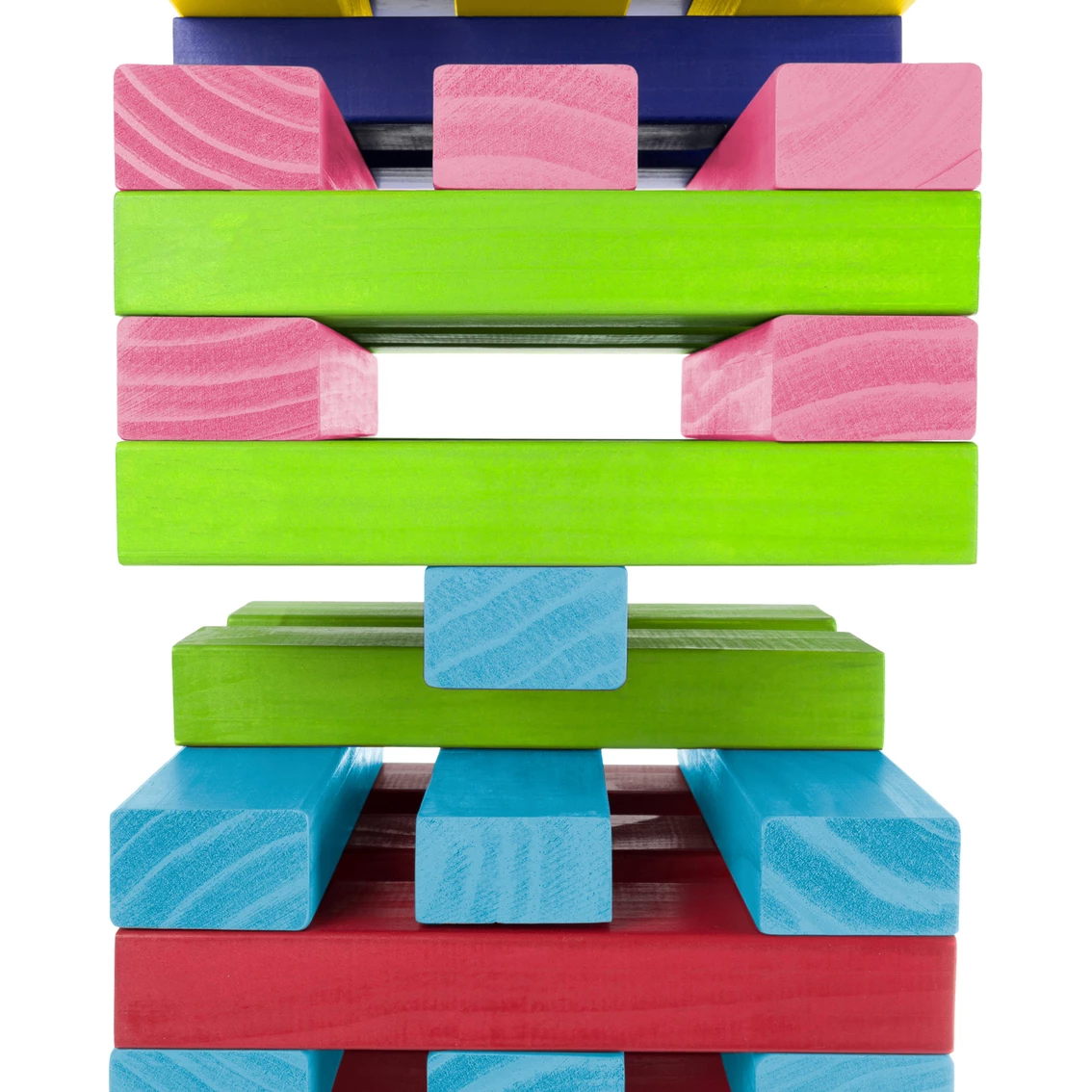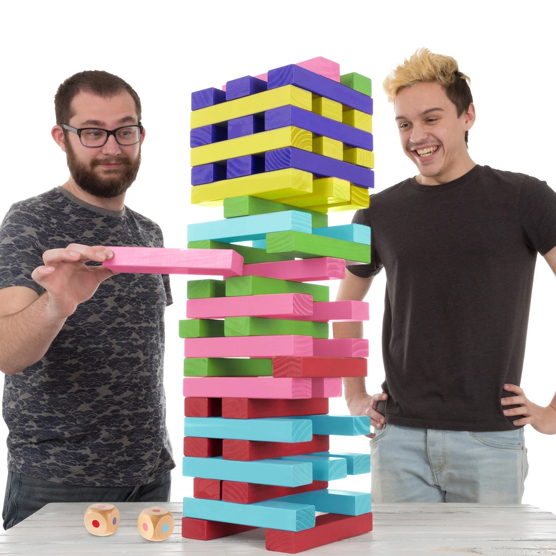The Nontraditional Giant Wooden Blocks Tower Stacking Game by Hey! Play! takes a classic stacking game to new heights. The 54 wooden blocks are hand-crafted out of pinewood, and can stack over 4 ft. tall. The dimensions of these blocks allow the game to be set up with spaces between the blocks, making it much more challenging than traditional stacking games. With a nylon carrying case for easy storage, the game is perfect for backyard parties, picnics at the beach or just about anywhere. This set also includes 2 multicolored dice to add an extra dimension of play and more game options. Model: M350129.