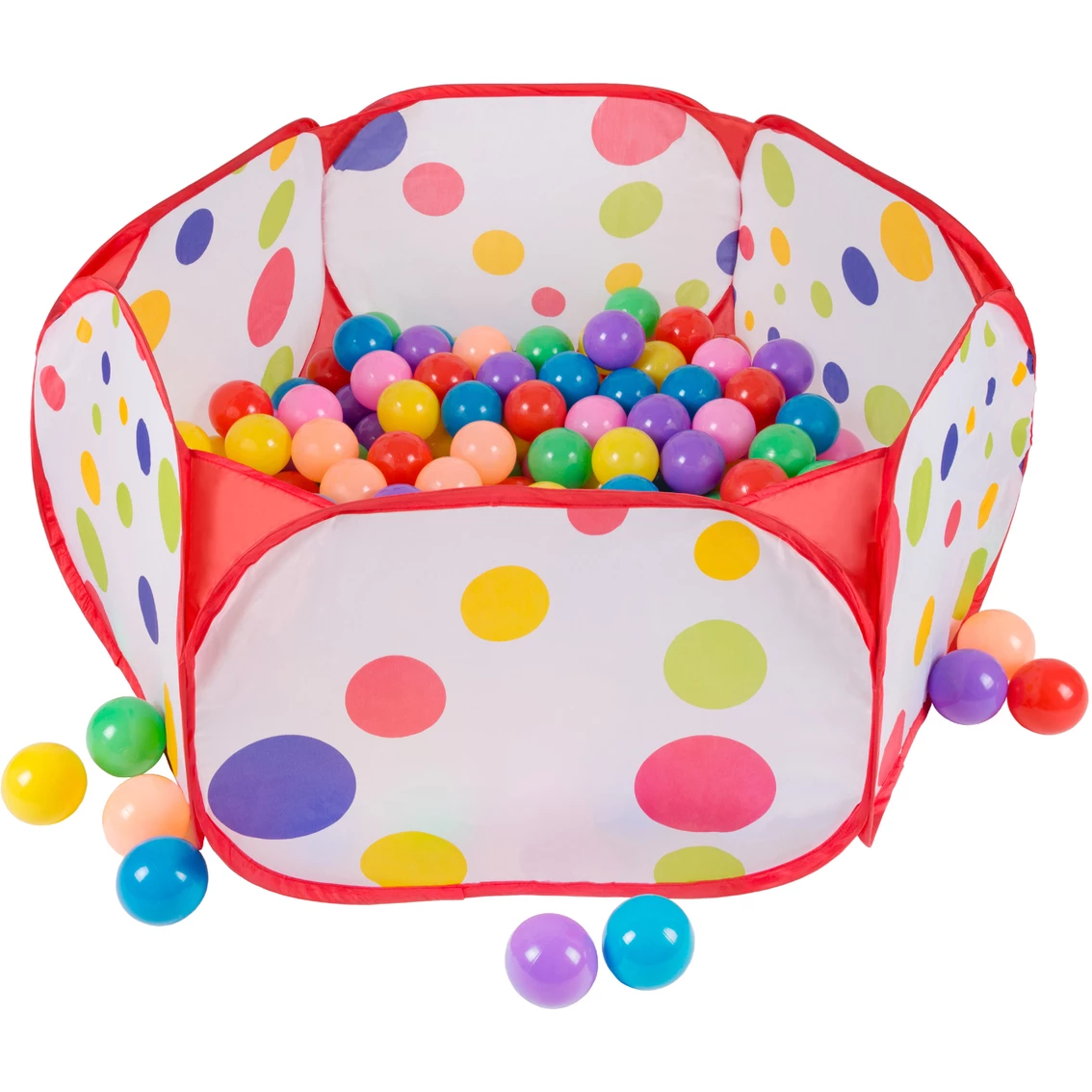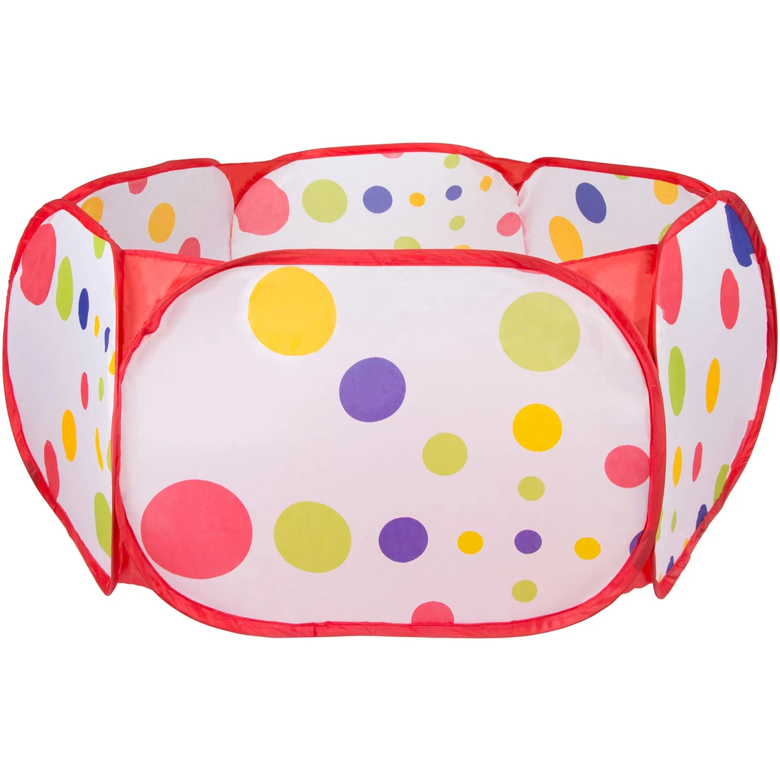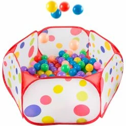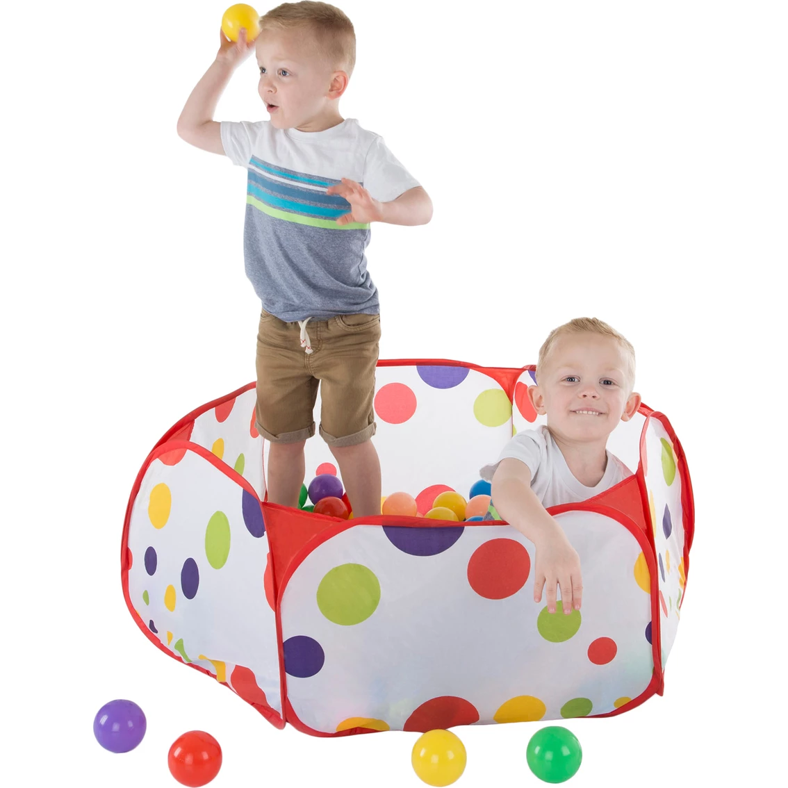 The Kids Pop-up Ball Pit Tent is a bundle of fun! A fun hexagon shaped playpen with colorful balls is the perfect activity for toddler boys and girls, and can be used inside and outside. The easy to use six-sided playpen is bright and colorful and pops open for effortless assembly, and also folds up for simple takedown. The portable tent-like material is a waterproof polyester fabric, and is easy to clean with a damp towel. The included 200 balls are made of phthalate free and crush-proof plastic, so they will hold up to the roughest of play without any toxicity. Balls come in seven colors: purple, blue, green, yellow, red, pink and orange. Includes two mesh storage bags with adjustable closure to hold all 200 balls. Makes for easy transport. Ball pit measures 35 in. across, contains six sides measuring 15 in. tall and 21 in. wide. Balls measure 2.5 in. in diameter. Designed for up to two kids at a time. Model: M350027.