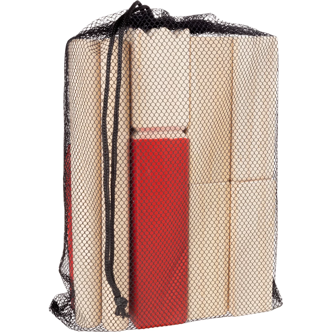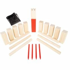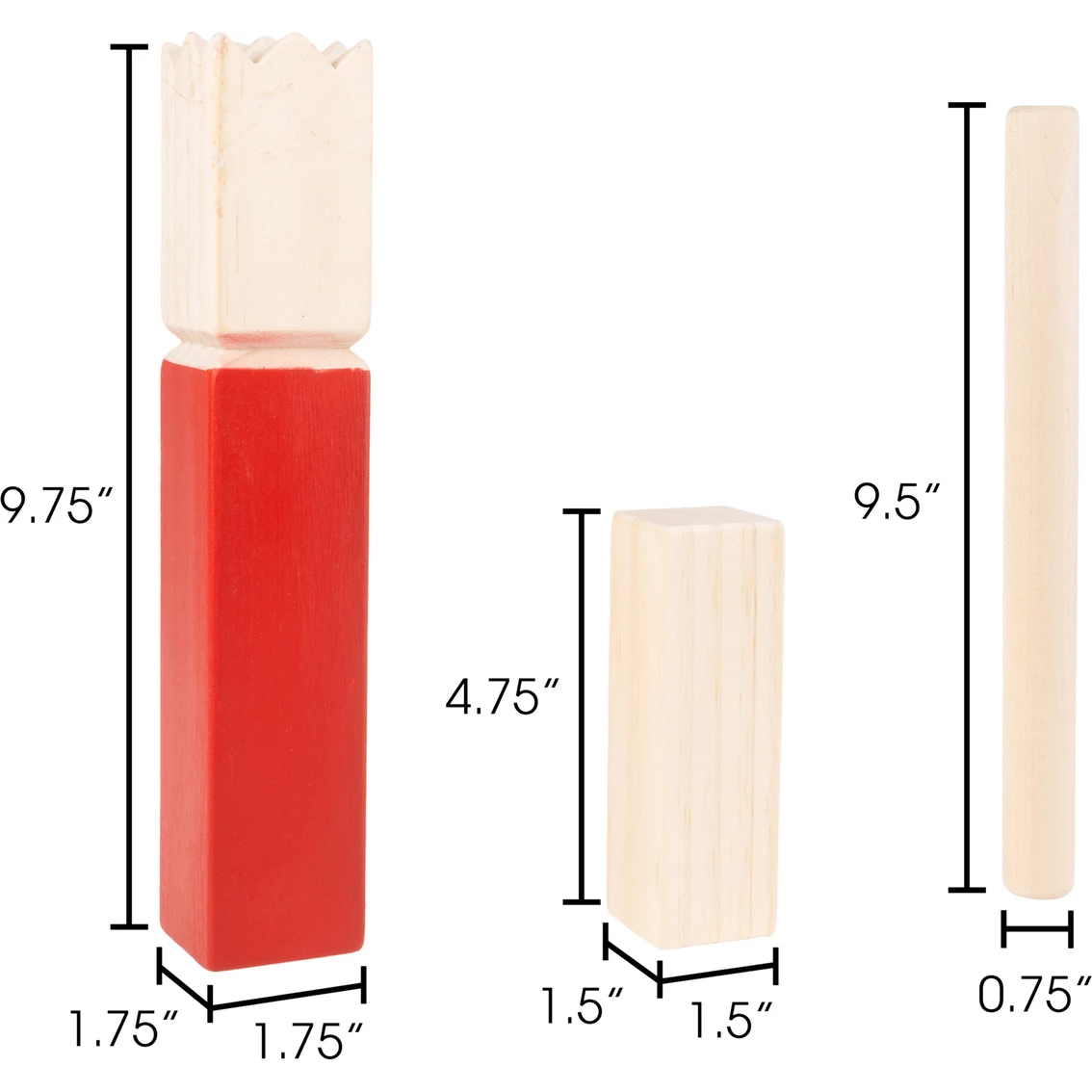 Wood and Nylon. Dimensions: King – 1.75 in. x 1.75 in. x 9.75 in., Kubbs – 1.5 in. x 1.5 in. x 4.75 in., Tossing Dowel – 0.75 in. D x 9.5 in. H. Includes: 1 king, 6 batons, 4 corner markers and mesh carry bag. Color: Natural Wood. King – Red.