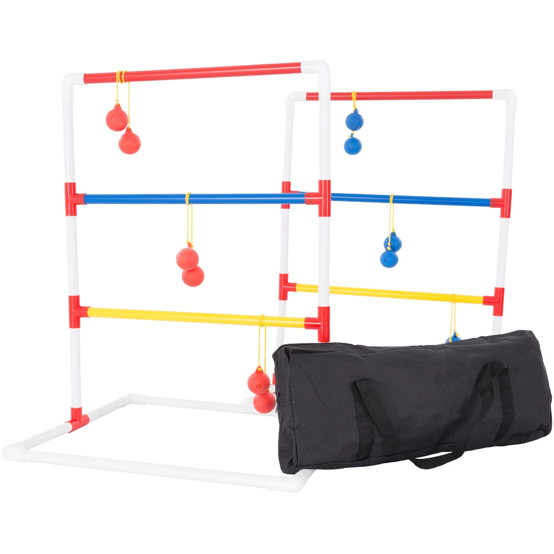 Product Details: 2 ladder targets measuring 30 in. high x 22 in. long x 22.75 in. wide with an 6 golf-ball style bolas, 3 blue and 3 red, and a zip-up carrying case.