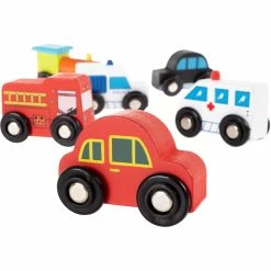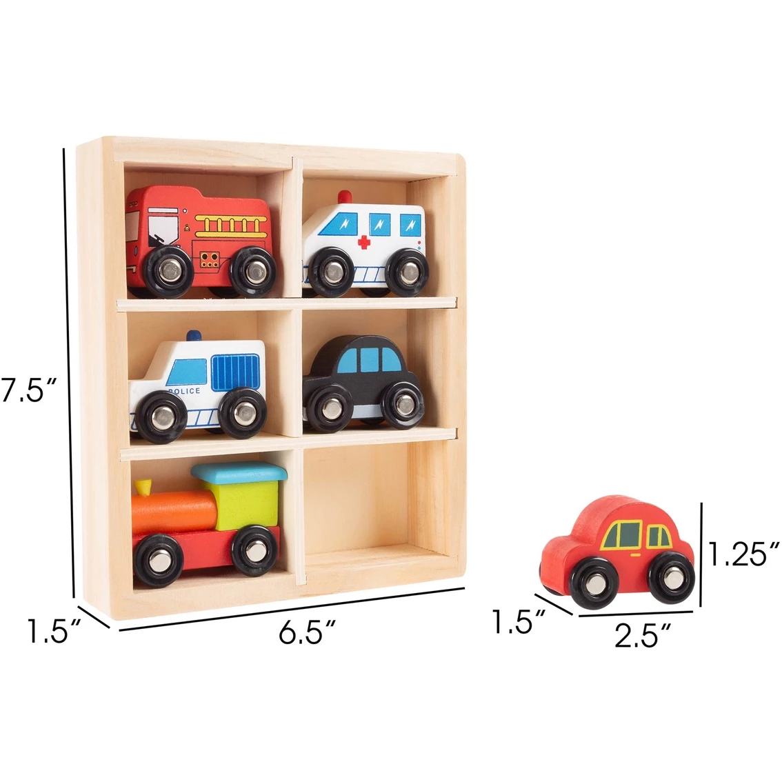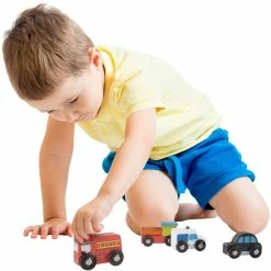 The Wooden Car Set by Hey! Play! is a classic toddler toy that your little boy or girl will surely love! This 6-piece set comes with two cars, police and fire trucks, an ambulance, and a train engine, so your little one will have a variety of vehicles to play with. Each car in the set was hand-painted and is perfectly sized for little hands, while manipulating and playing with the vehicles can help your child with developing fine motor skills and dexterity as they have fun. A sturdy wood box is also included for easy cleanup, storage, and travel, or to display this colorful set in your child’s room! Your child will enjoy hours of imaginative fun with this timeless toy. A sturdy wood box is also included for easy cleanup, or even to display this colorful car set in your child’s room! Each car in the set was hand-painted and is perfectly sized for little hands. Manipulating and playing with the vehicles can help your child with developing fine motor skills and dexterity as they have fun. The car set is durable enough to be played with anywhere and is compatible with most train or track sets. It’s a great addition to a mini town or activity rug! Your children will enjoy hours of imaginative fun with this timeless toy. Model: M420035.