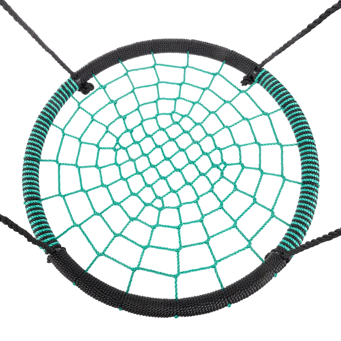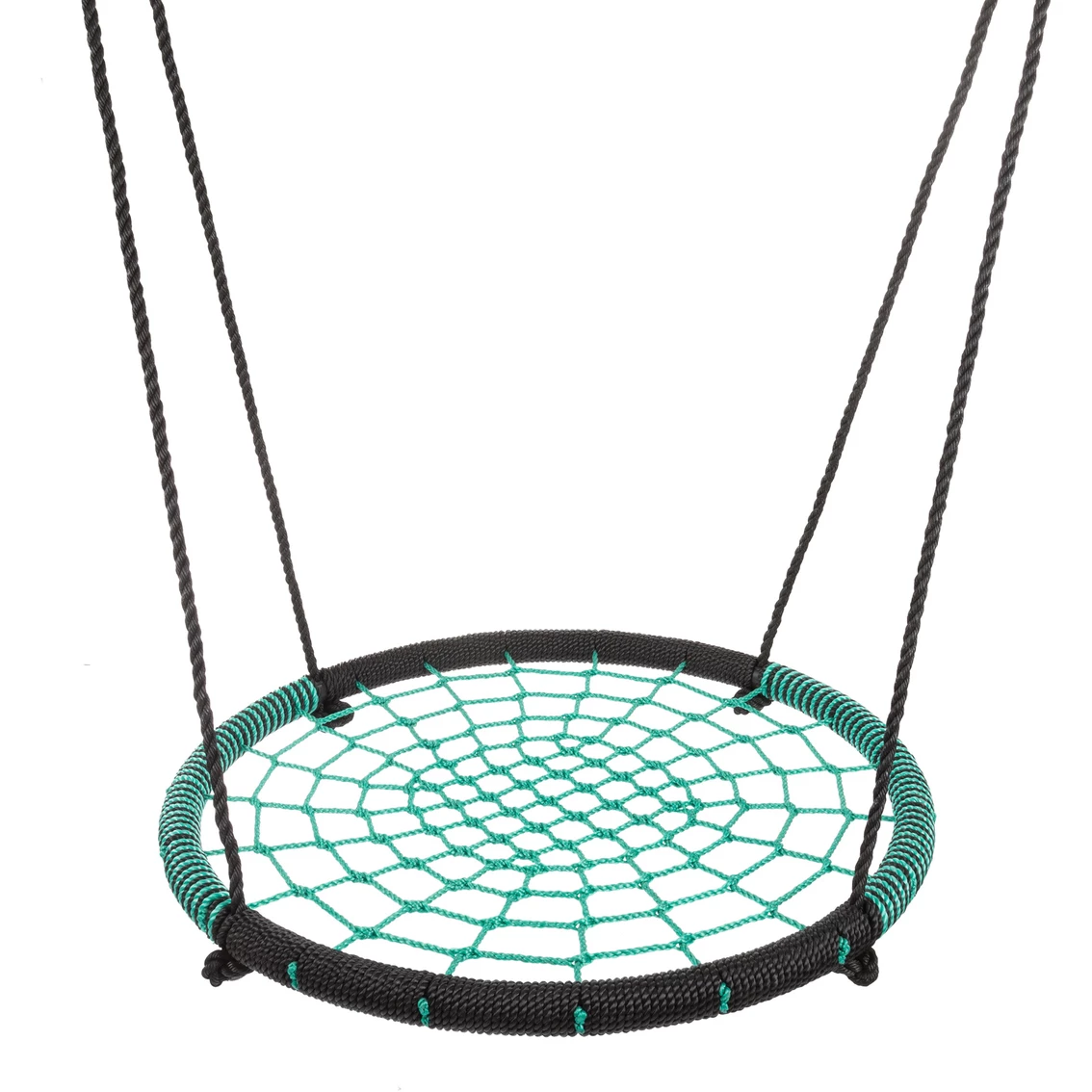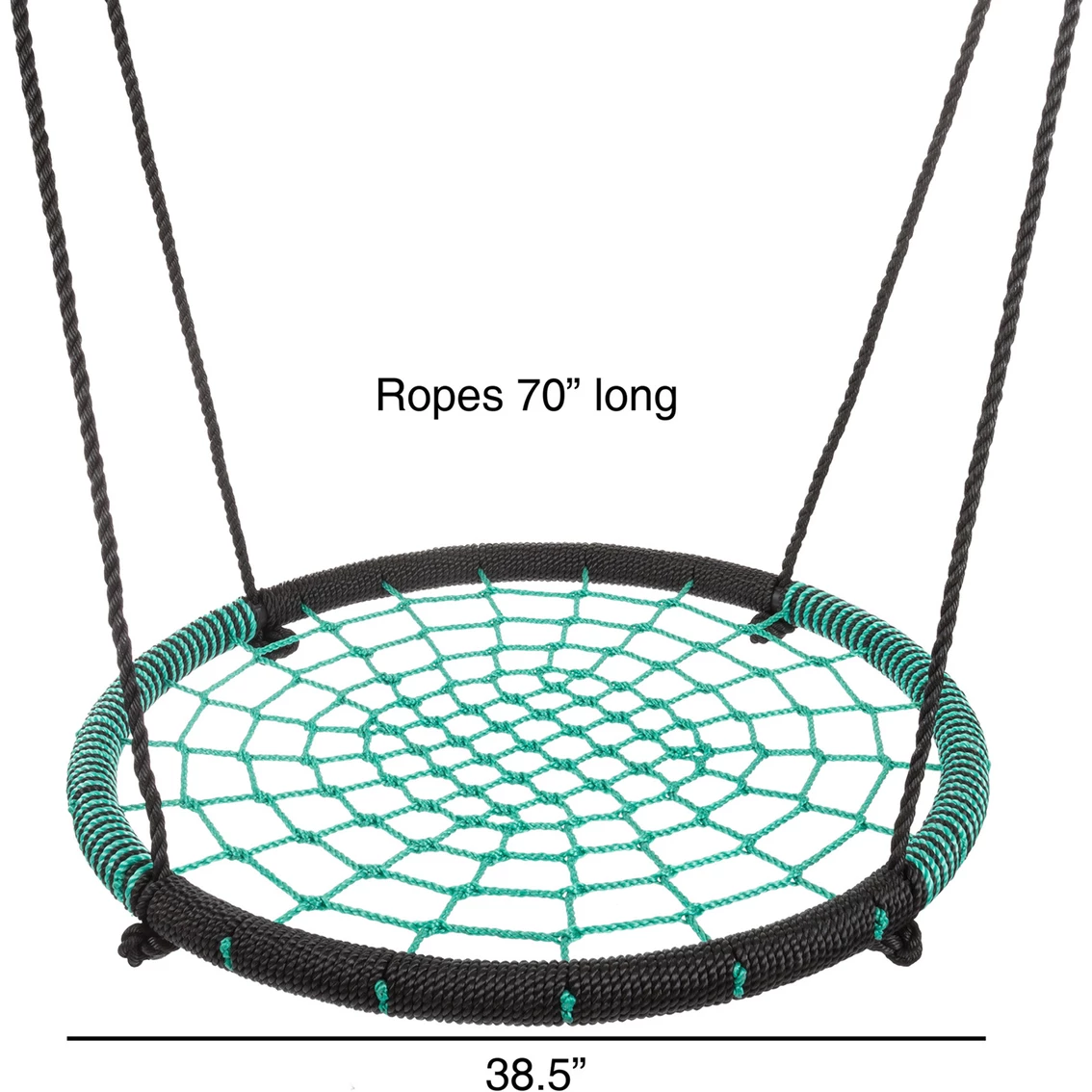 The Spider Web Tree Swing by Hey! Play! is a fun outdoor activity for boys and girls, making it the perfect addition to your backyard playground equipment. The swing comes fully assembled and is equipped with multiple nylon rope attachment points to hold onto for balance and comfort. It is also durable and safe with thick nylon rope around the entire swing and handles for safety and security. Simply attach rope swing to a strong tree branch or existing playground set, and watch as your children enjoy hours of healthy fun. NOTE: For one rider at a time, weight limit is 100 lbs. Adult supervision advised. Hanging kit not included. Dimensions: 38.5 in. in diameter. Length from rope to base: 70 in.