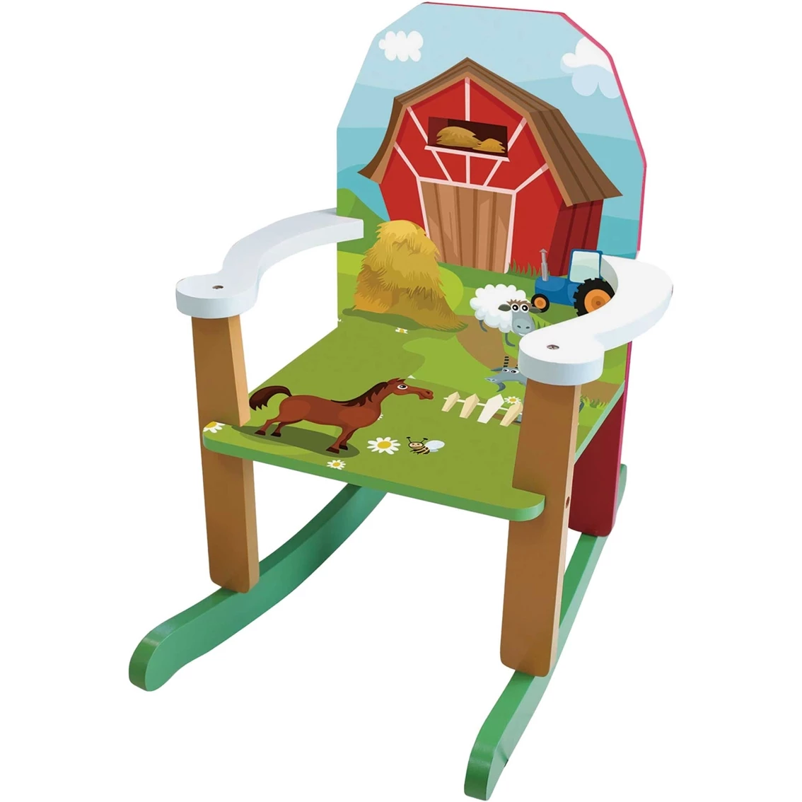 The Homewear Farm Rocking Chair is a perfect child-sized designed wooden rocking chair. The colorful farm print is great for your home and nursery. Model: 980M.