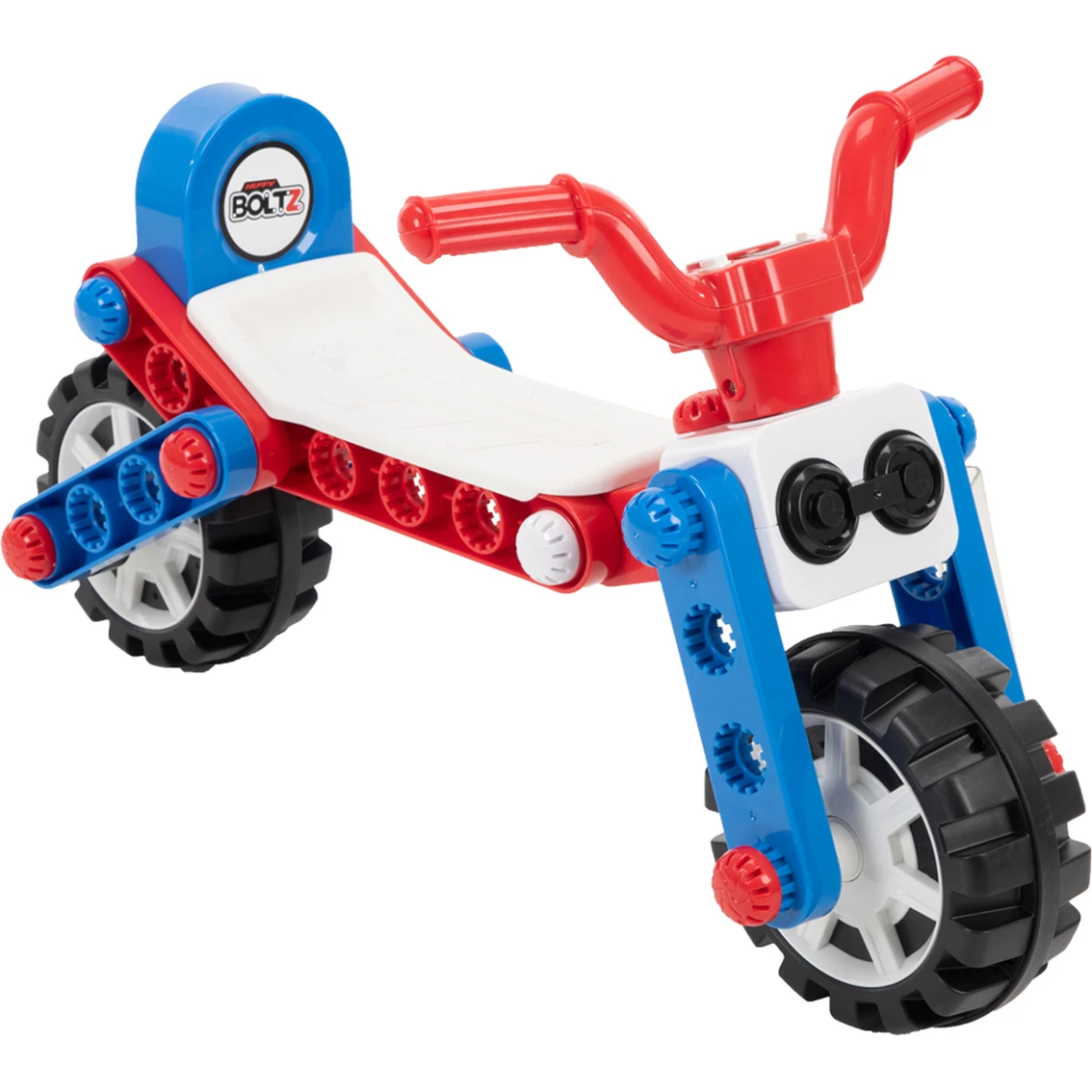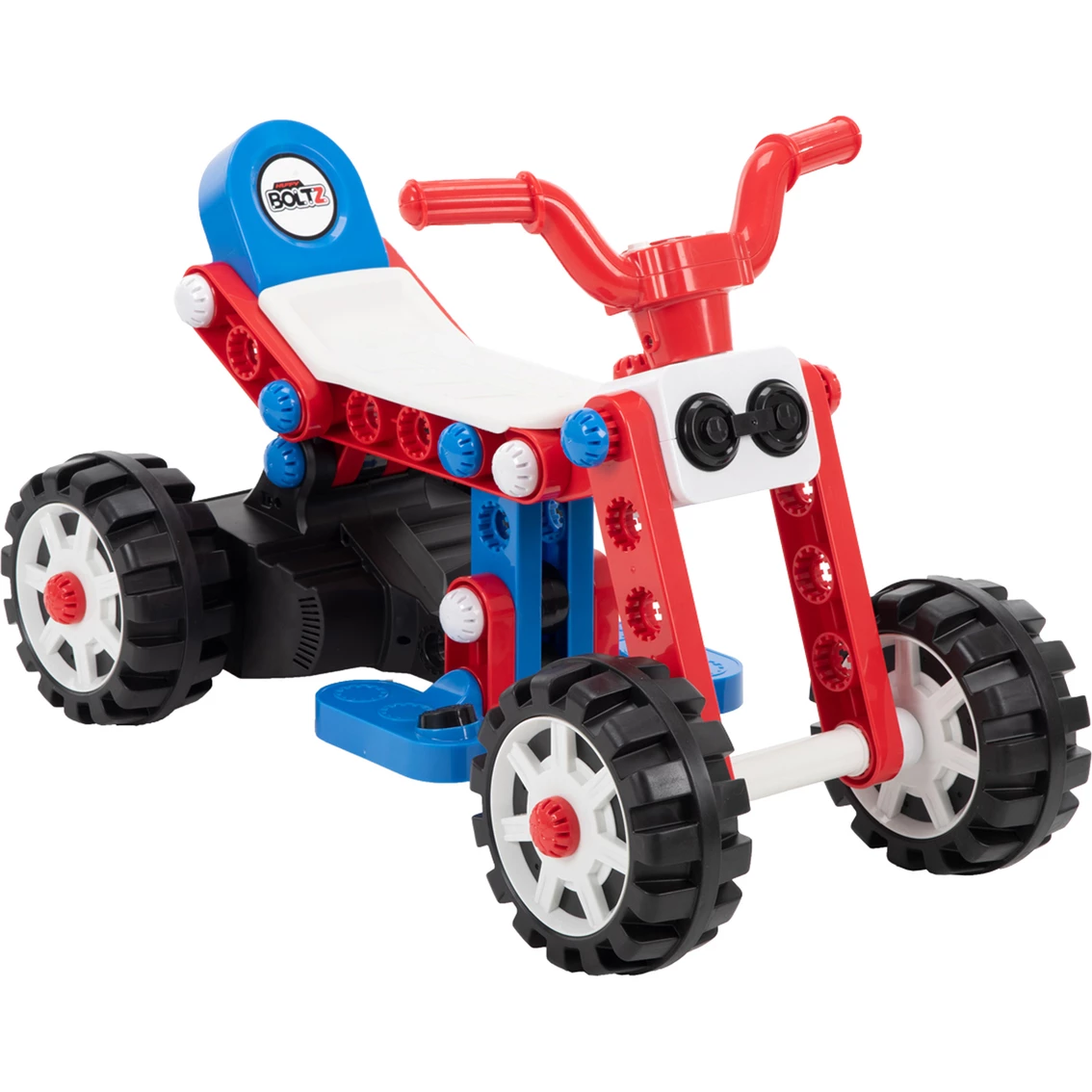 Exercise creativity and build memories with the Huffy Boltz to build three different ride ons! Assemble and disassemble as often as you like (easy tools included!); build a battery-powered quad, a battery-powered trike, or a non-powered balance bike. The battery powered ride on makes fun engine and horn sounds (two AA batteries required – not included). You and your child can team up to follow the easy step-by-step instructions assemble each option with the bright red, white and blue pieces. Charge the toy with the supplied wall charger. It is easy to use the foot pedal for control. This ride-on toy is designed for children between the ages of 1.5 and 3 years old with a maximum weight of 50 lb. The Huffy Boltz electric ride on toy can be disassembled and reassembled as a battery powered quad or trike or a non-powered balance bike. This ride-on is ideal for kids between 1.5 and 3 years old with a maximum weight of 50 lb. Horn and motor sounds enhance the riding experience (2 AA batteries required for sound features – not included). All necessary tools included to assemble and disassemble as often as you like; 71 pieces total; twist and turn attachments; build memories and exercise creativity with your child.