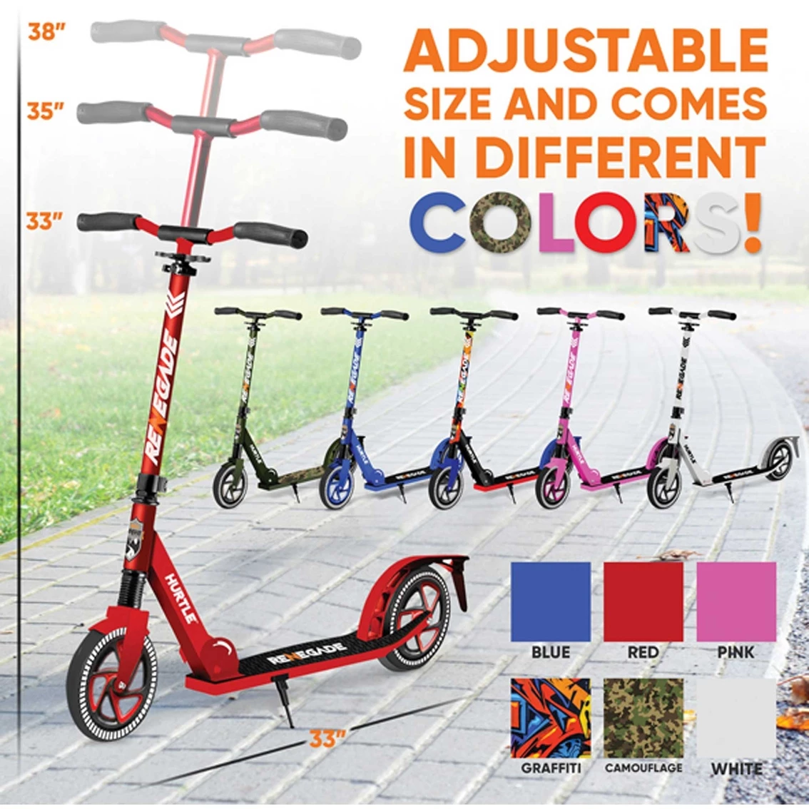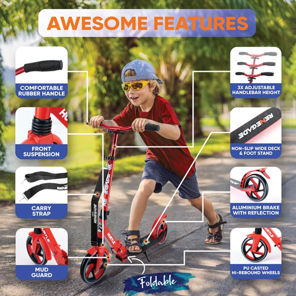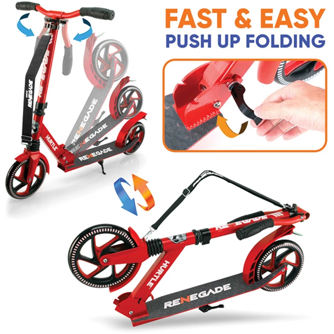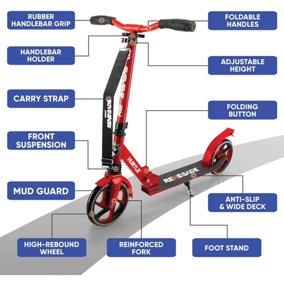 Kick it into high gear with the Red Hurtle Renegade Foldable Kick Scooter! This is a compact kick scooter with a lightweight alloy deck. It features smooth riding wheels, and is ideal for both indoor and outdoor use.