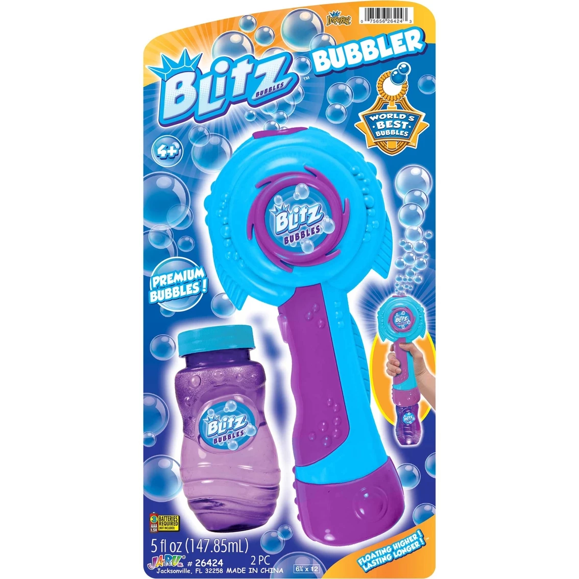Blitz Bubbles Bubbler from Ja-Ru makes the world’s best bubbles. Premium bubbles. Press and hold button for continuous bubbles! Bubble jar attached to base. Requires three AAA batteries, not included. Model: 26424.