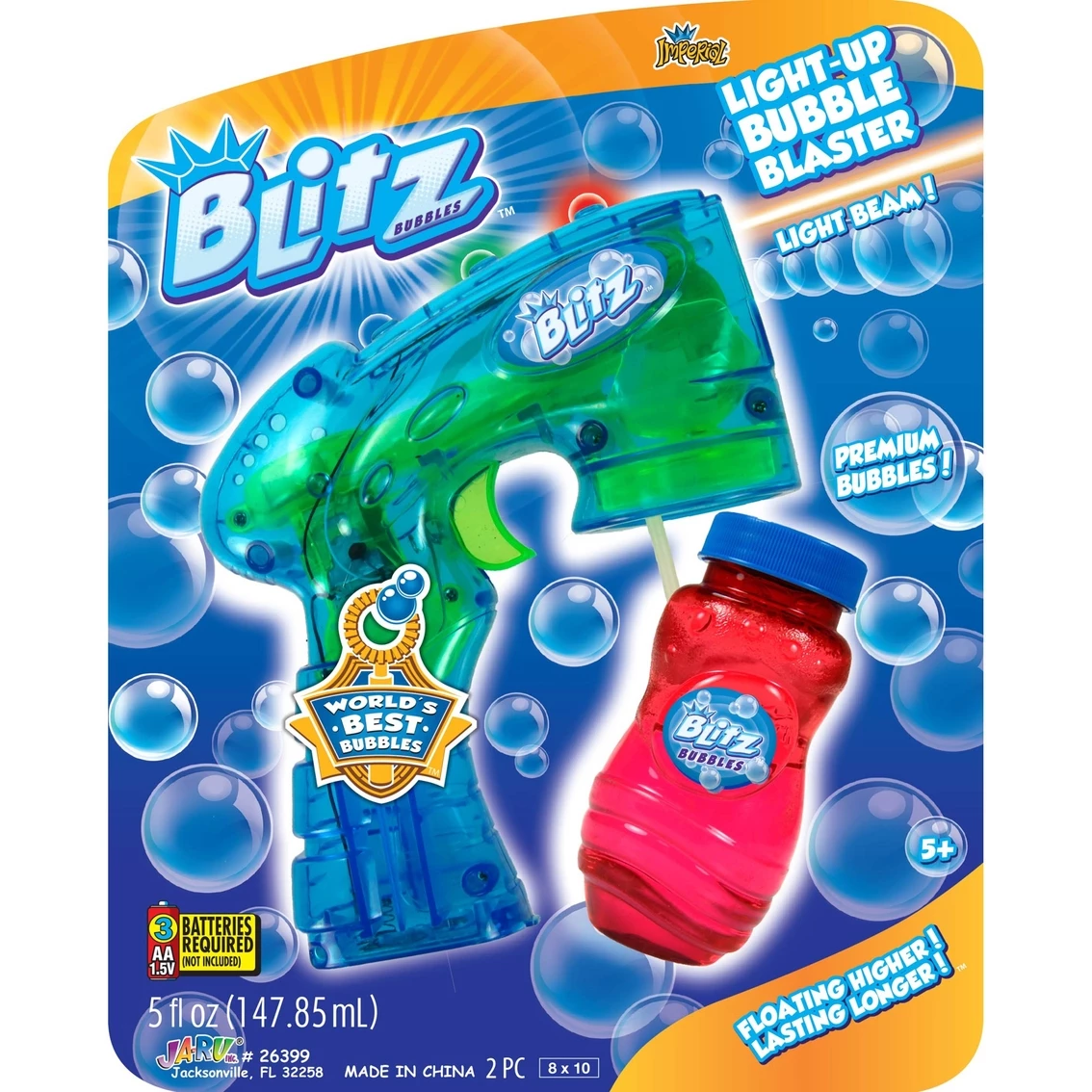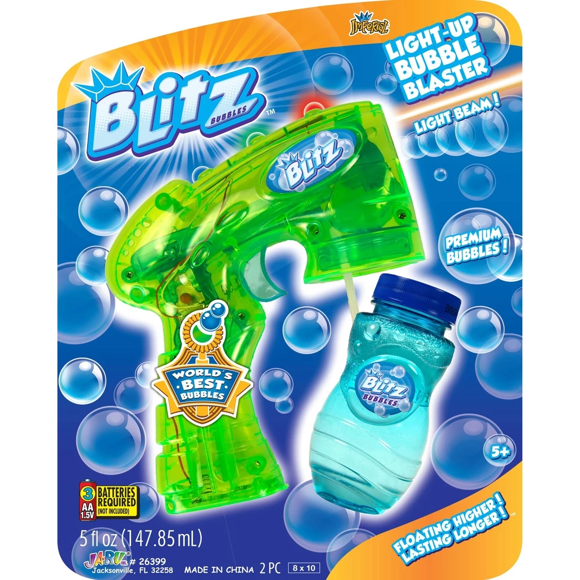 The Ja-Ru Blitz Light Up Bubble Blaster gives you the worlds best bubbles. Includes a bubble tray and 9.5 in. wand! Comes in 3 colors.