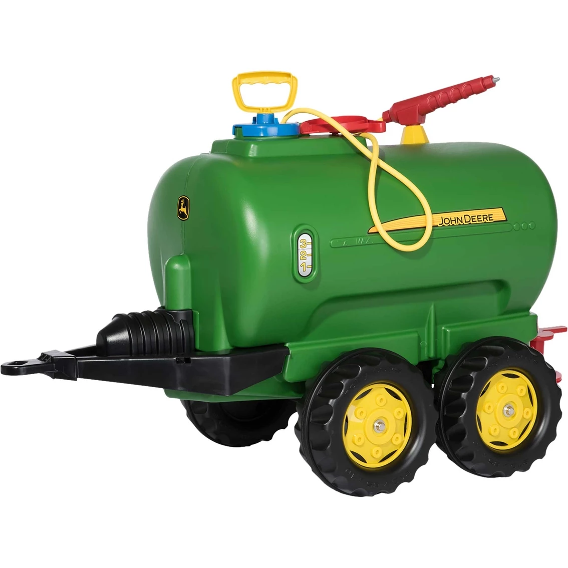 This giant twin axle Tanker Toy from John Deere is suitable for all the larger rolly Tractors. It has a top mounted filling lid with a removable pump. Pump the handle to activate the hand held spray nozzle. Includes a rear tap that allows water to be released in a fan spreading motion. Tanker holds up to 5 gal. of liquid.